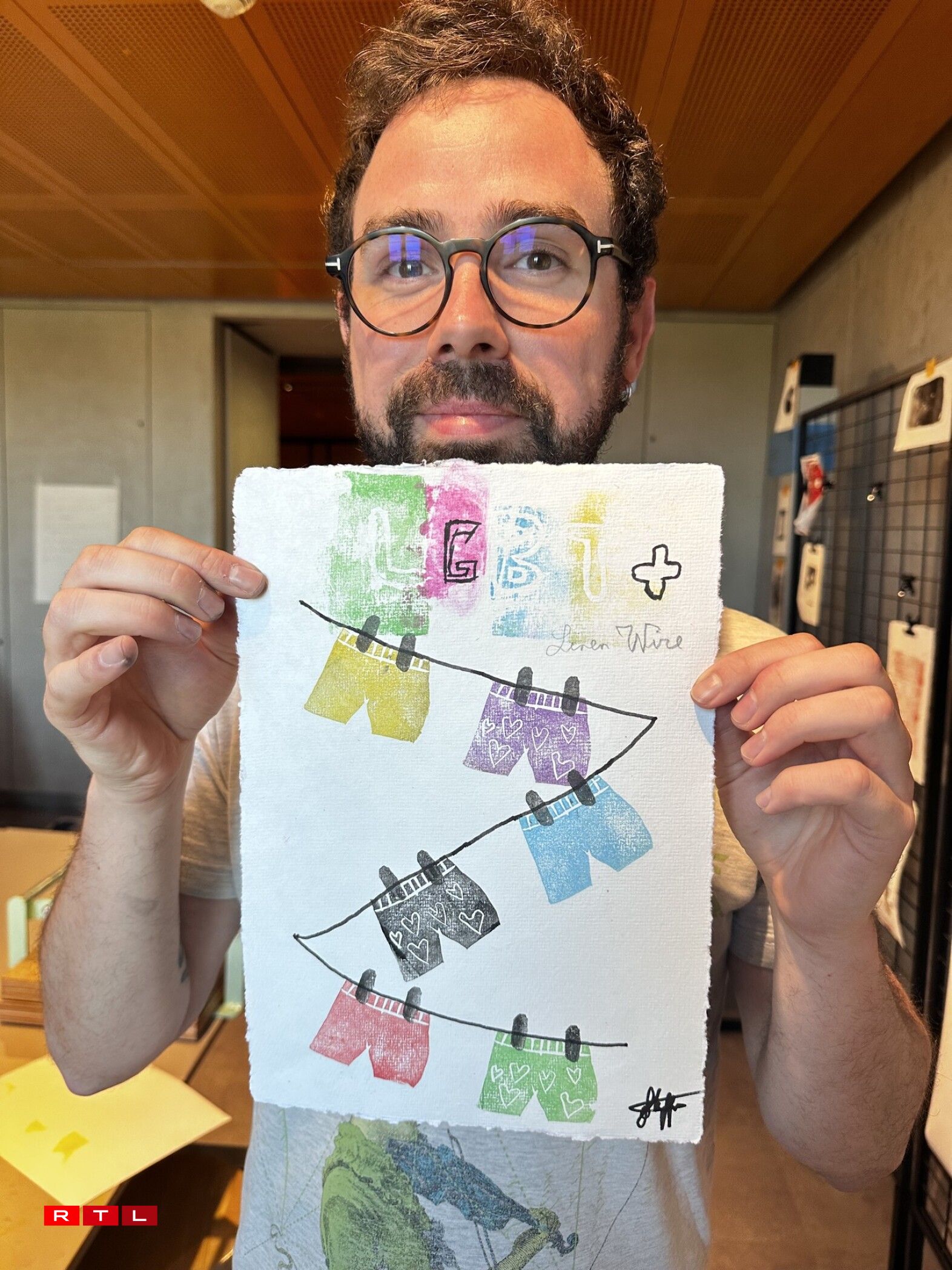 Obschonns ech definitiv kee grousse Kënschtler sinn - ech iwwerloossen dat normalerweis léiwer Leit, déi eppes Anstänneges op d’Blat kréien an ech schreiwen dann driwwer - hunn ech fir meng Chronik am No Art On Air bei engem Workshop matgemaach, dee vum Zoé Thill ofgehale gouf. Wéi een onschwéier an der Sendung erkenne konnt, war ech immens houfreg iwwer mäi Resultat.