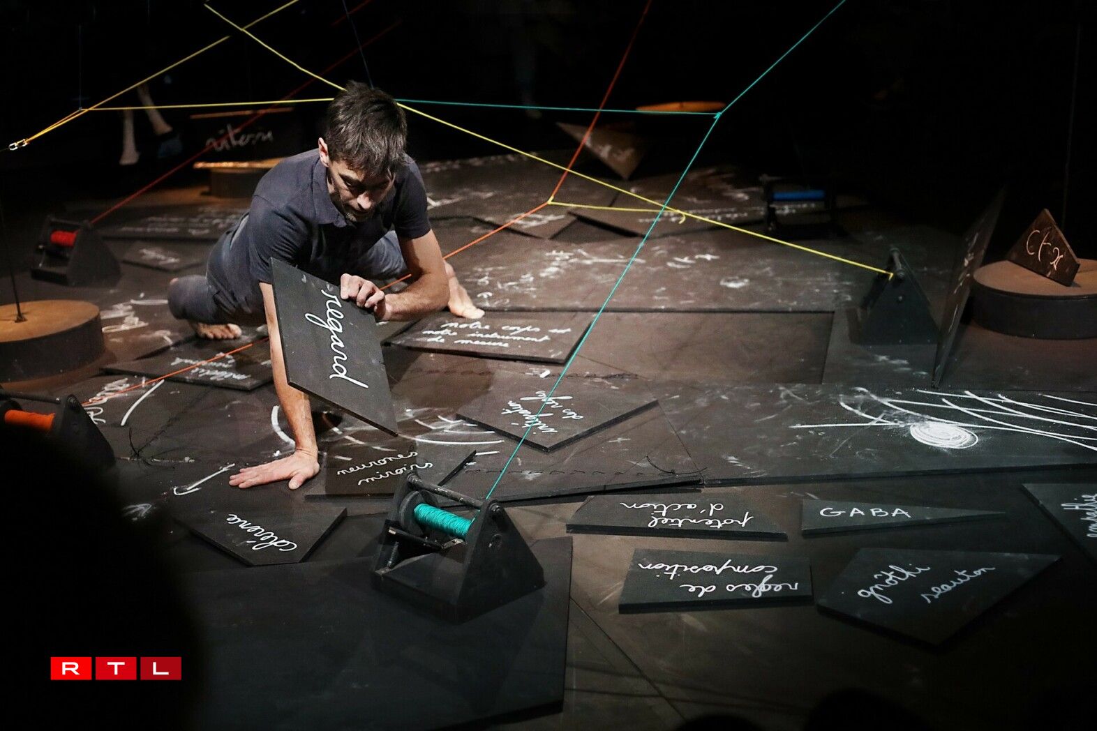 A sengem Stéck “La théorie des ficelles” léist den Étienne Fanteguzzi déi zwou Usiichten openeentreffen an erkläert esou Wëssenschaft unhand vun der Konscht. Déifgrënneg a komplex Theorië sollen doduerch verständlech duergestallt ginn. De But vum Kënschtler ass dobäi “d’Freed un der wëssenschaftlecher Ausenanersetzung matzedeelen an och de Geescht vum Publik wärend der ganzer Opféierung a Beweegung ze setzen”.