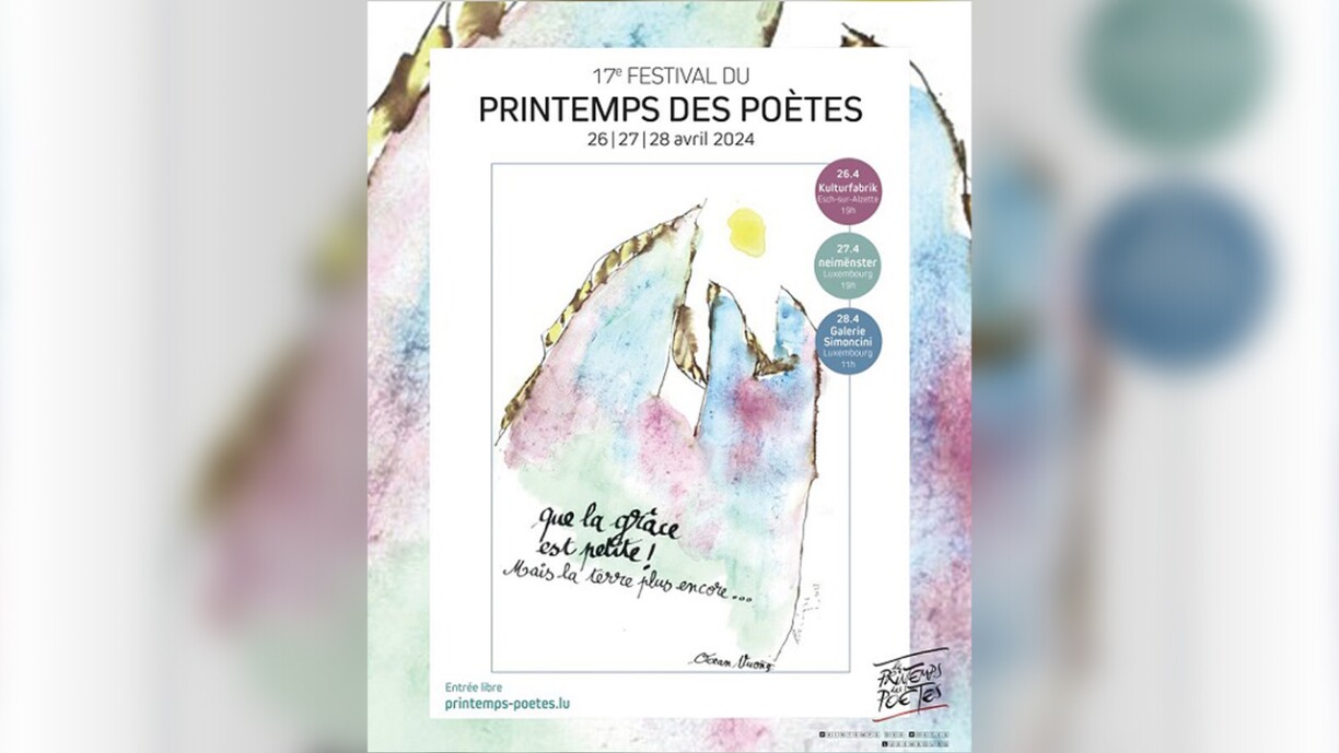 Vum 26. bis den 28. Abrëll bréngt de Festival “Printemps des Poètes” nees 12 Poeten aus 11 verschiddene Länner op Lëtzebuerg, déi dem Public mat hire Kreatiounen déi aktuell Tendenze vun der zäitgenëssescher Dichtkonscht presentéieren. D’Motto vun dëser Editioun: “La Grâce”.