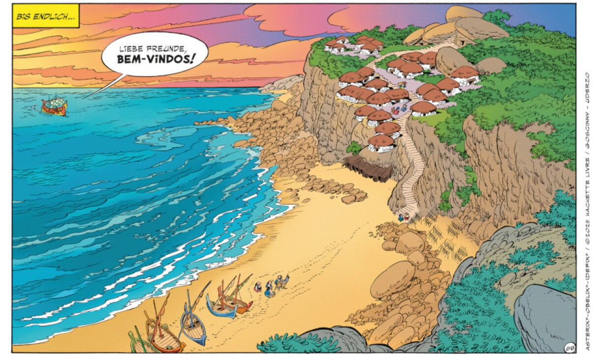 An och wann et déi éischt Visitt an deem Land fir d’Gallier ass, esou gouf et schonn Optrëtter vu Lusitaner virdrun. Am “Astérix et la Transitalique” waren der zwee dran, a virun allem als Sklaven, déi um Bau vum “Domaine des Dieux” geschafft hunn, sinn si scho vum René Goscinny an Albert Uderzo an d’Zeen gesat ginn.