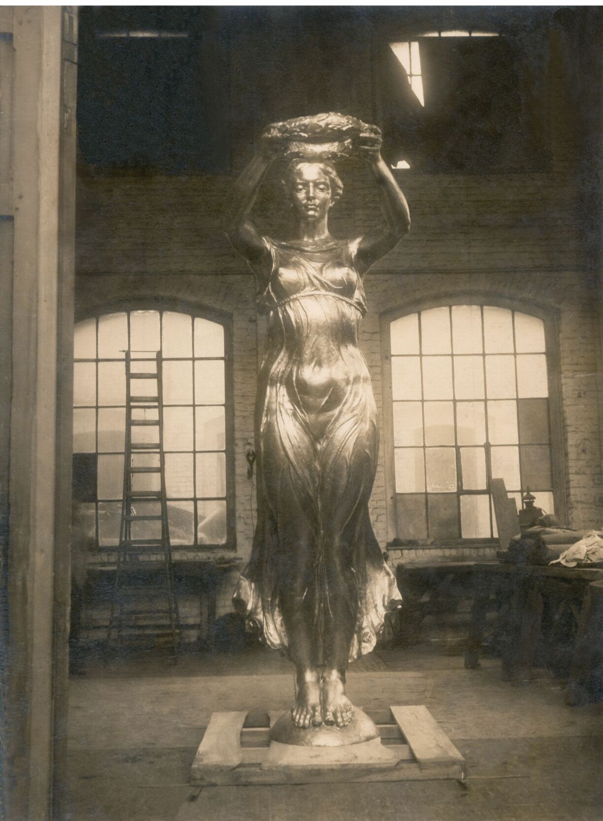 Gewosst ass, dass se vum Sculpteur Claus Cito geschaf ginn ass an den 27. Mee 1923 feierlech inauguréiert gouf. Si ass zu Bréissel an der Géisserei “Compagnie des bronzes” an 3 Deeler gegoss.
