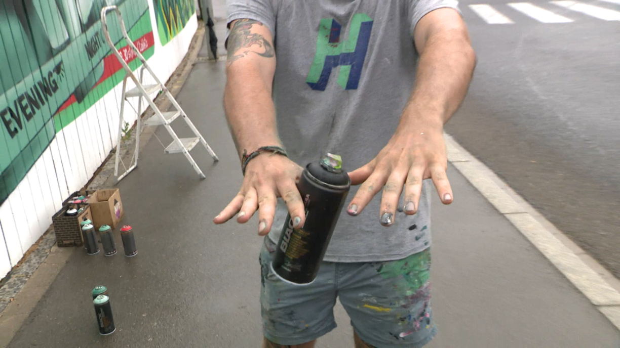 Den Alain Welter oder “MOPE”, wéi en an der Zeen bekannt ass, weist op der Areler Strooss wat e kann. Hie schafft ganz modern, ouni Blat a Pabeier an zeechent seng Iddien direkt um Tablet. “Ech hunn eenzel Fotoe vu Pëlle geholl an ausgeschnidden an agefüügt. Esou konnt ech d’Gréissten esou veränneren wéi ech se wëll hunn”, erkläert en. Fir säi Projet da vum klengen Ecran op d’Mauer ze kréien huet de Kënschtler 2 Deeg geschafft.