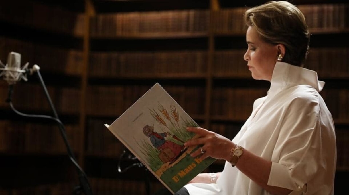 De Serge Tonnar an d’Grande-Duchesse hate sech dëser Deeg Rendez-vous um Schlass Bierg ginn, fir ee ganz besonneschen Tournage. An Zesummenaarbecht mat der Violoncellistin Annemie Osborne, déi fir déi musikalesch Begleedung zoustänneg war, an der Artistin Milla Trausch, huet d’Grande-Duchesse aus dem bekannte Lëtzebuerger Kannerbuch “D’Maus Kätti” virgelies.