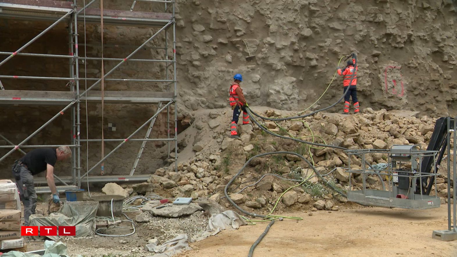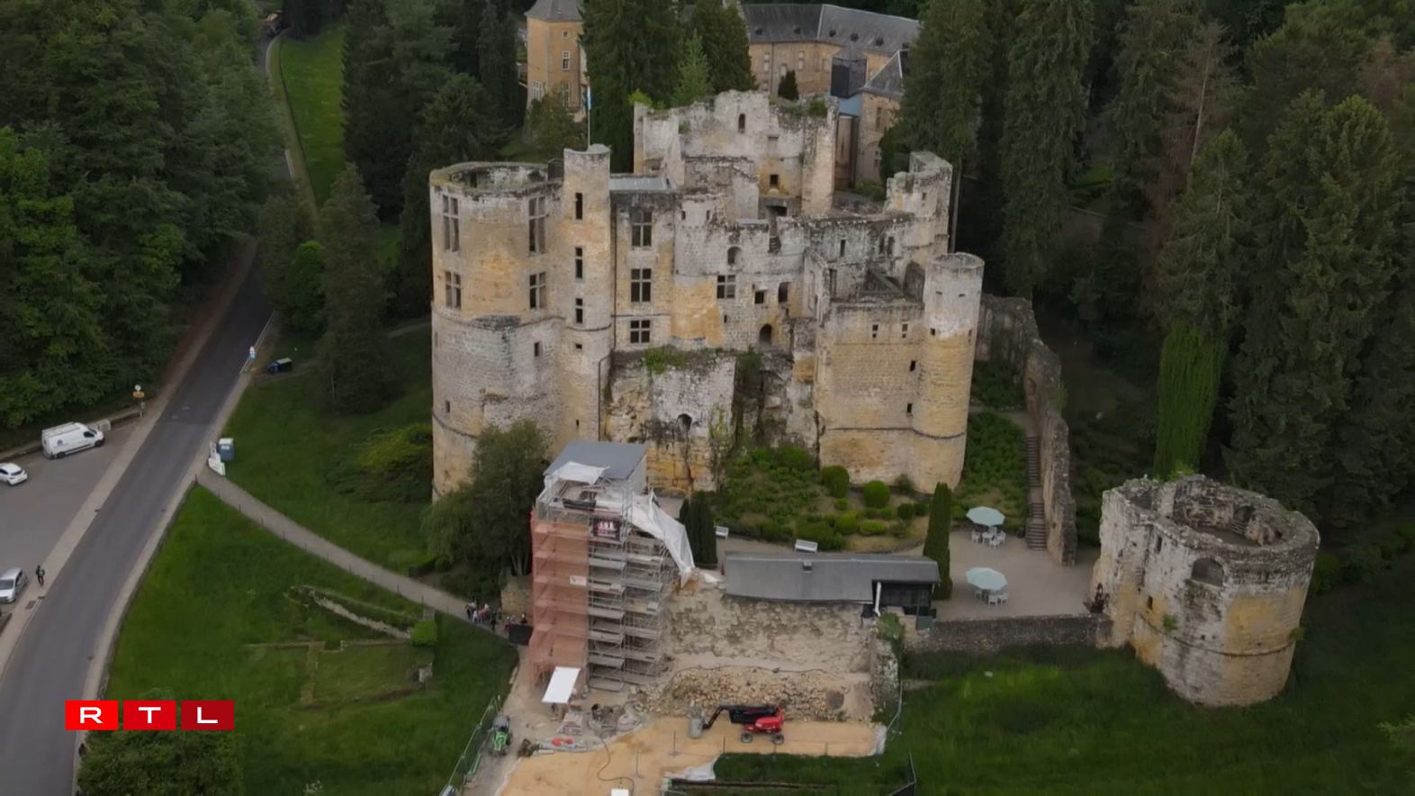 D’Restauratioun vun der Buergmauer war néideg, well dës 2021 wéinst dem Héichwaasser zesummegefall war. Sëllege Leit a Firmen hu beim Opbau vun der Mauer matgehollef, dorënner d’Waasserwirtschaftsamt, Réibauer, Ingenieuren a Spezialiste wéi Bauhistoriker an Archeologen. Dat alles war wichteg, fir dass de Stee vun der neier Mauer zum Rescht vun der Buerg passt, sou de Patrick Diederich, Architect-Conservateur vum Institut national pour le patrimoine architectural.