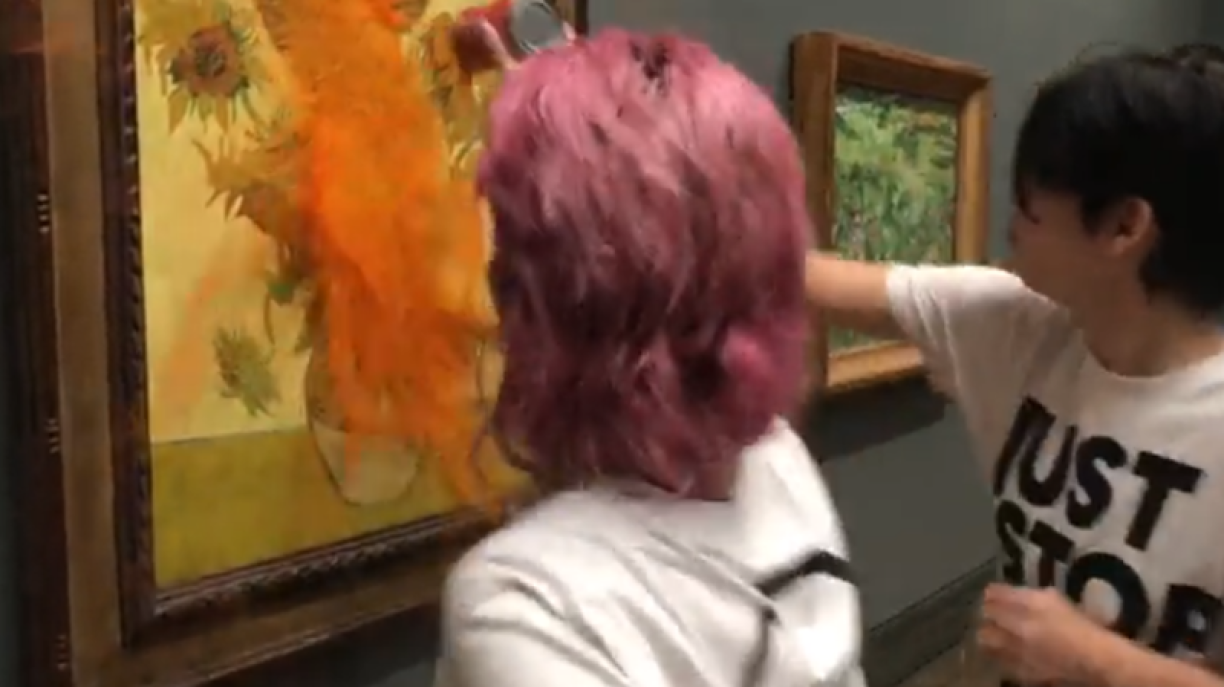 Wéi d’Ëmwelt-Gruppéierung “Just Stop Oil” matgedeelt huet, hu béid jonk Fraen, déi een och op engem Video gesäit, zwou Dousen Tomatenzopp op dat weltberüümt Bild vum hollännesche Moler Vincent Van Gogh geschott. D’Bild selwer gouf vun enger gliese Plack geschützt. Hannert der Aktioun stécht d’Fuerderung un déi brittesch Regierung, direkt all nei Ueleg- a Gas-Projeten ze stoppen.