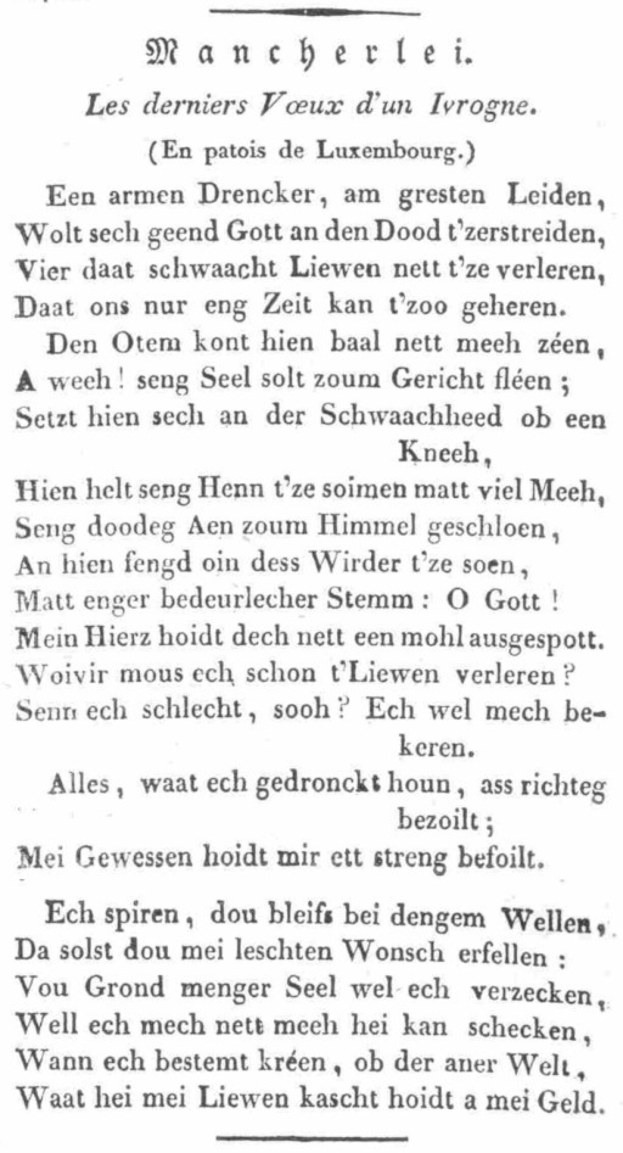 Op den Dag virun engem Mount, den 10. Dezember 2025, hat d’Actioun Lëtzebuergesch och drun erënnert, datt et du genee 200 Joer hier waren, datt deen éischten zesummenhängenden Text op Lëtzebuergesch gedréckt gouf. “Den Text ass e Gedicht iwwer een aarmen Drénker mam franséischen Titel Les derniers Vœux d’un Ivrogne a koum am Luxemburger Wochenblatt, Ausgab 50/1825, eraus”, esou den AL-Sekretär Patrick Kaell a senger E-Mail. Déi Ausgab wier och an der eLuxemburgensia nozekucken.