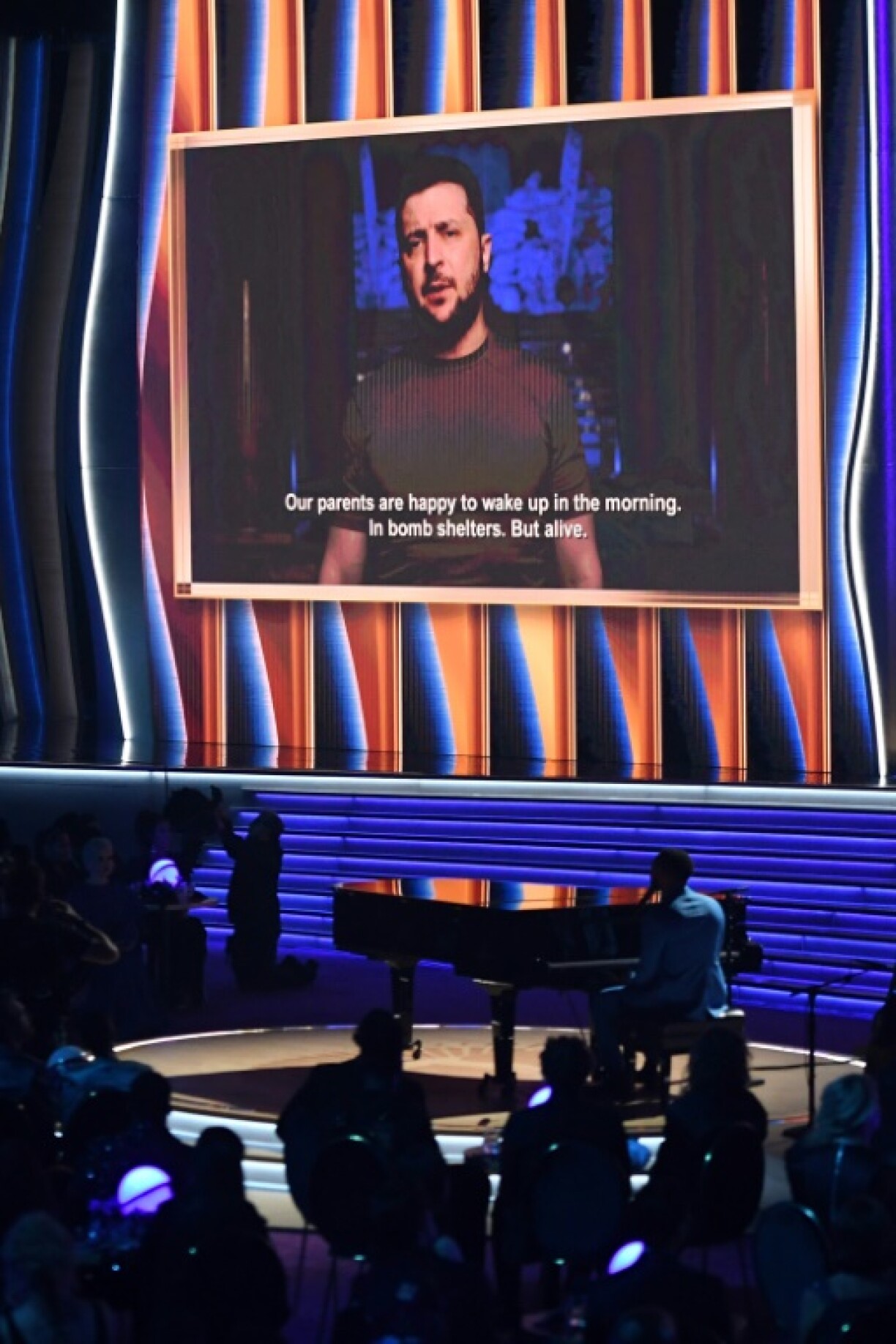 Nieft Optrëtter vum Billie Eilish an dem John Legend gouf awer och den ukrainesche President Selenkyj mat enger Videobotschaft bäigeschalt, an där hie jiddereen dozou opgefuerdert huet, d’Ukrain am Kampf fir hir Fräiheet ze ënnerstëtzen.