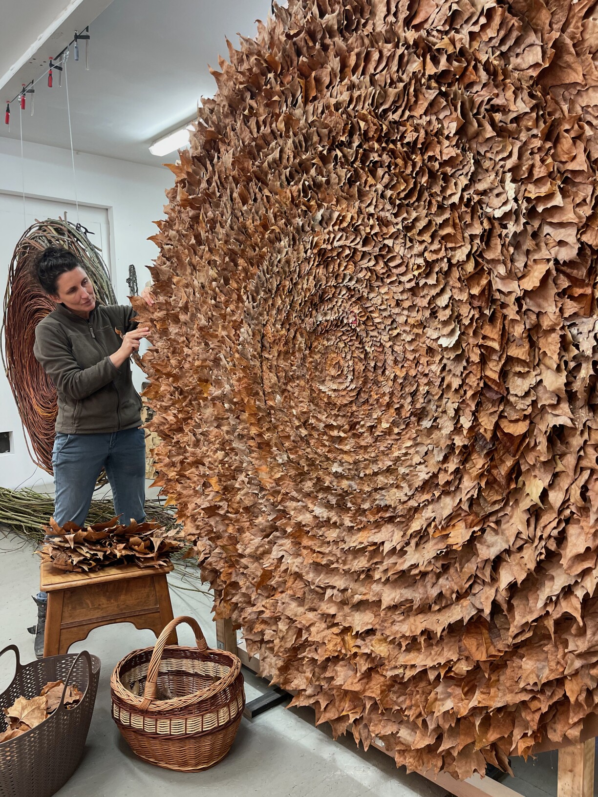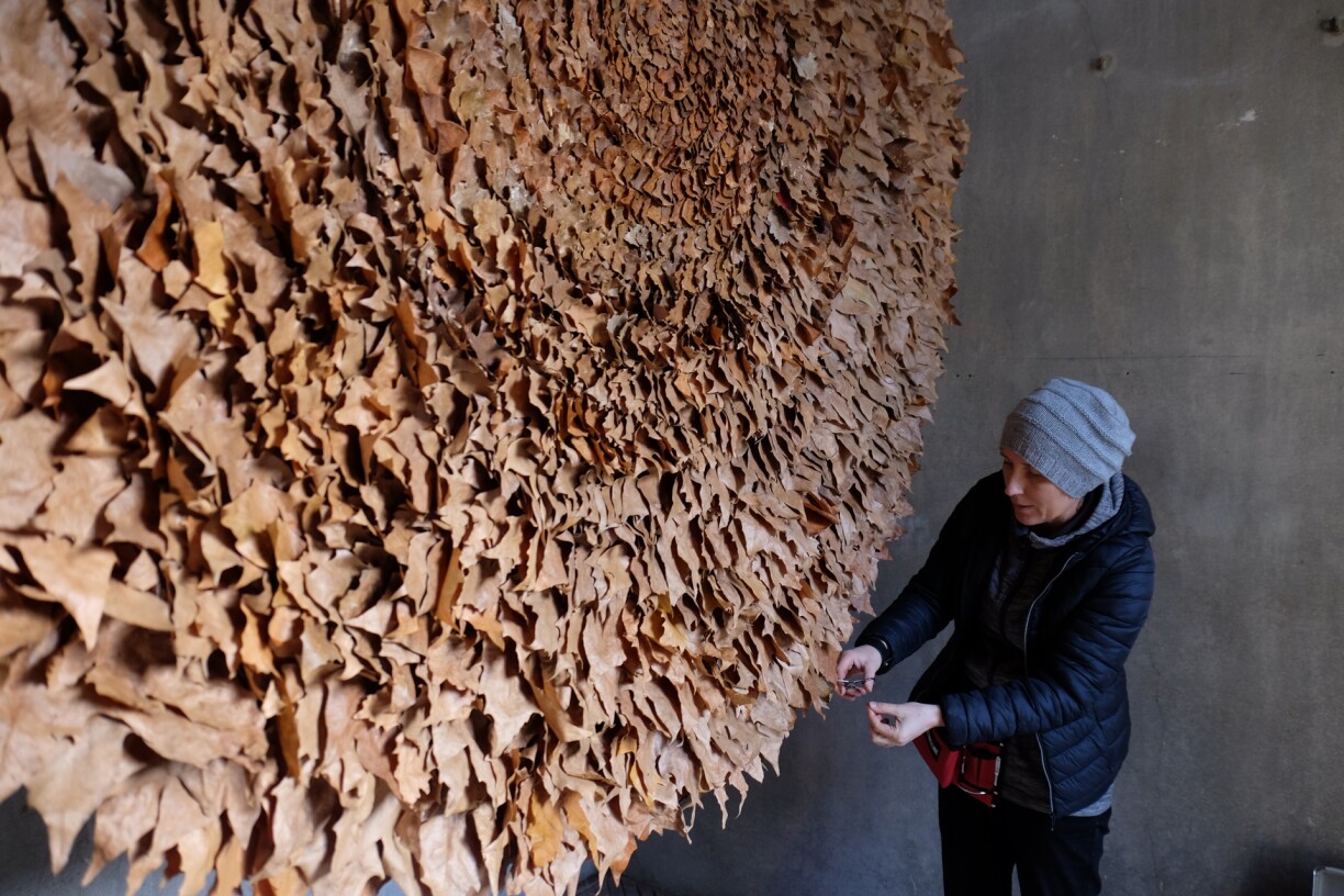 Dat éischt Stéck, wat ech weise wäert, ass en 2 Meter grousse Mandala, deen ech aus gedréchente Blieder gemaach hunn an deen d’Thema vun der Migratioun opgräift. De Victor Hugo sot eng Kéier: „Je ne puis regarder une feuille d’arbre sans être écrasé par l’univers.“ An dat Zitat huet mech immens gepräägt. Fir mech, si Blieder schonn ëmmer e Leitmotiv a menger Aarbecht gewiescht an ech gesinn an hinnen – bësse wéi den Hugo – eng Zort Metapher fir dat fragilt a vergänglecht Mënscheliewen. Wann een elo esou vill eenzegaarteg Blieder zesummesetzt zu engem Wierk, da verschmëlzen d’Blieder zu enger Unitéit. Dat nämmlecht geschitt, wa vill eenzegaarteg Mënschen zesummekomme fir an enger uniformer Gesellschaft ze liewen.