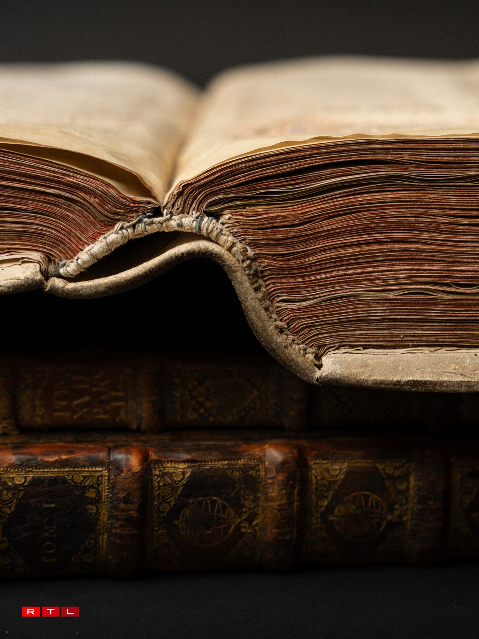 Impressionnant fir d’alleréischt wéinst den Dimensiounen, déi dës Risebibel huet. Wa se opgeklappt ass, ass se 60 op 80 Zentimeter grouss.