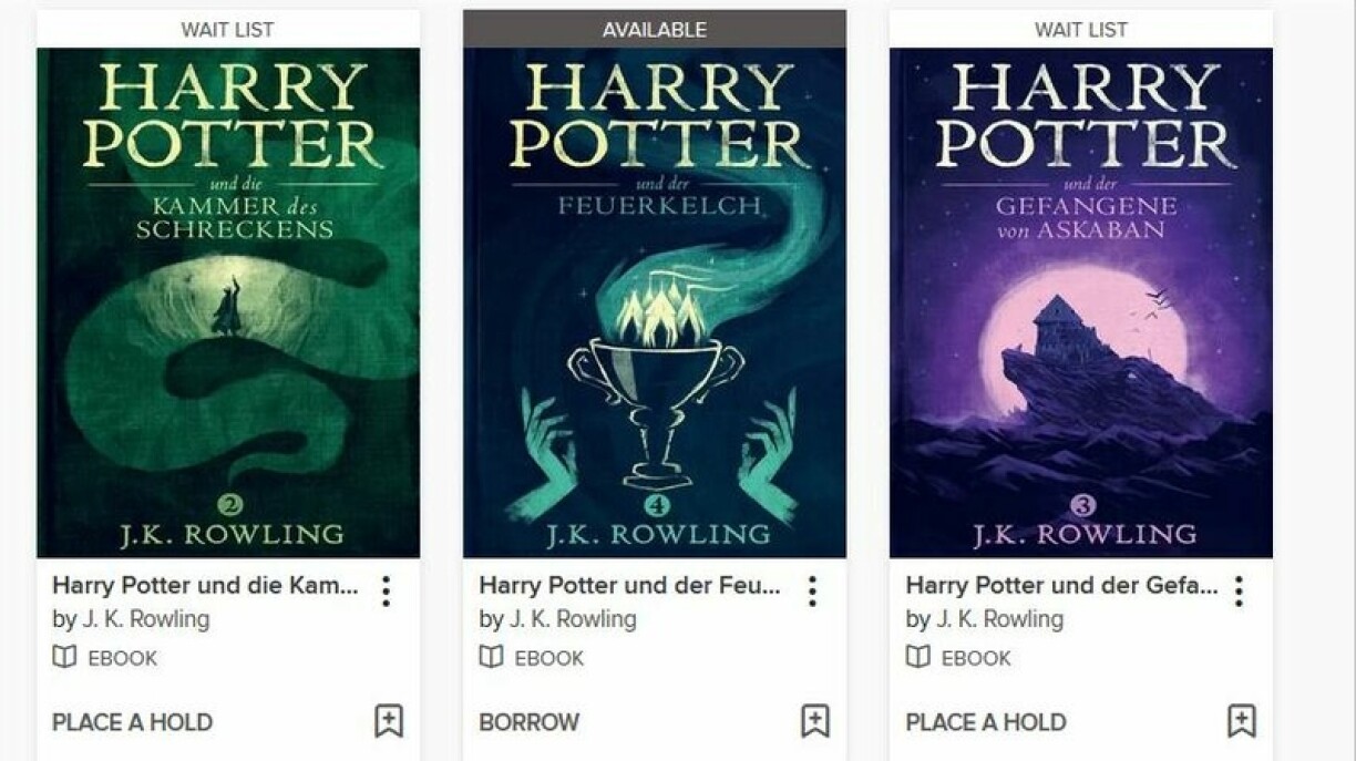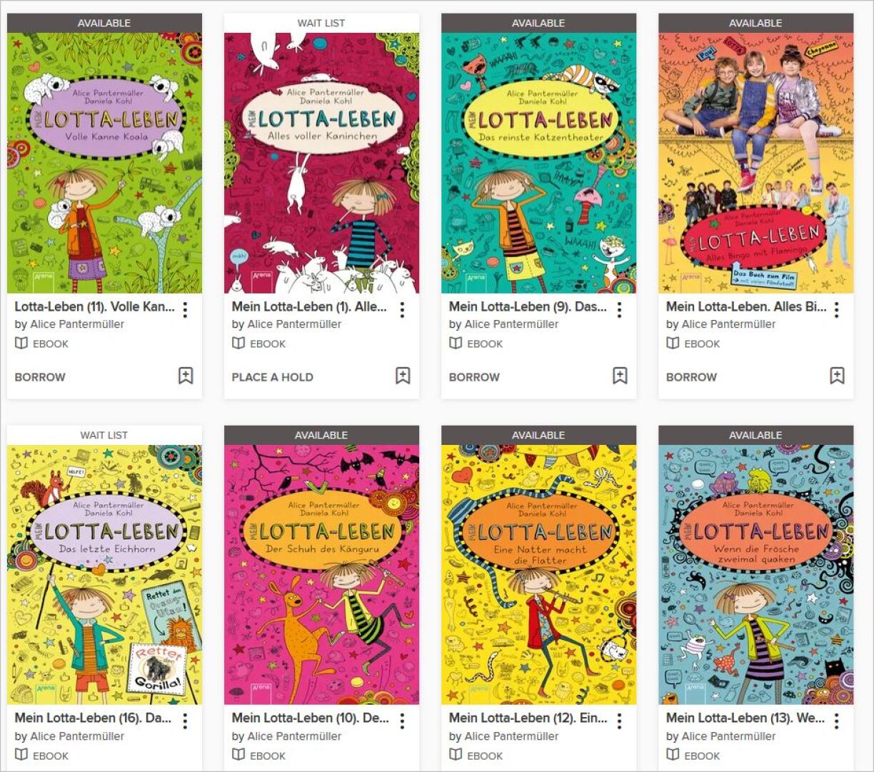 D’ebooks sinn disponibel op Däitsch, Franséisch an Englesch, dorënner bekannte Wierker wéi Dirt Diary Series, Fantastic Beasts, The Hunger Games, Malala’s Magic Pencil, Mein Lotta Leben, Tom Gates an Harry Potter.