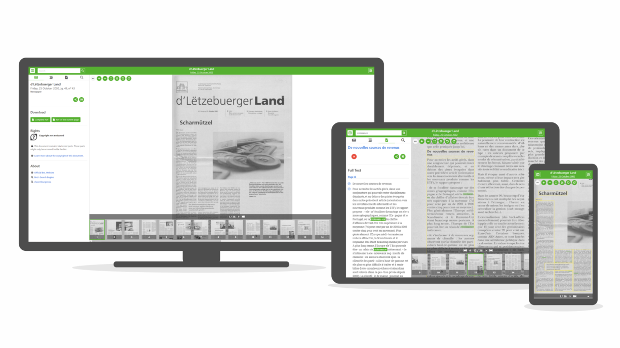 Mat der neier Visionneuse, déi d’BnL en Place gesat huet, kann een nach méi einfach duerch d’Zeitungen, historesch Dokumenter a Monografien, esou wéi al Affichen oder Postkaarten navigéieren.Aktuell sinn eng ronn 690.000 numeriséiert Säiten online. Ënnert den Dokumenter sinn ënnert anerem d’Tageblatt an d’Lëtzebuerger Wort bis zréck op 1950 ze fannen an d’Lëtzebuerger Land vun 2007 un.Déi nei Visionneuse kann een net just um Computer, mee och um Tablett oder Handy benotzen. Den neien Outil erméiglecht et an d’Dokumenter eran ze zoomen an eng héich Qualitéit ze behalen.