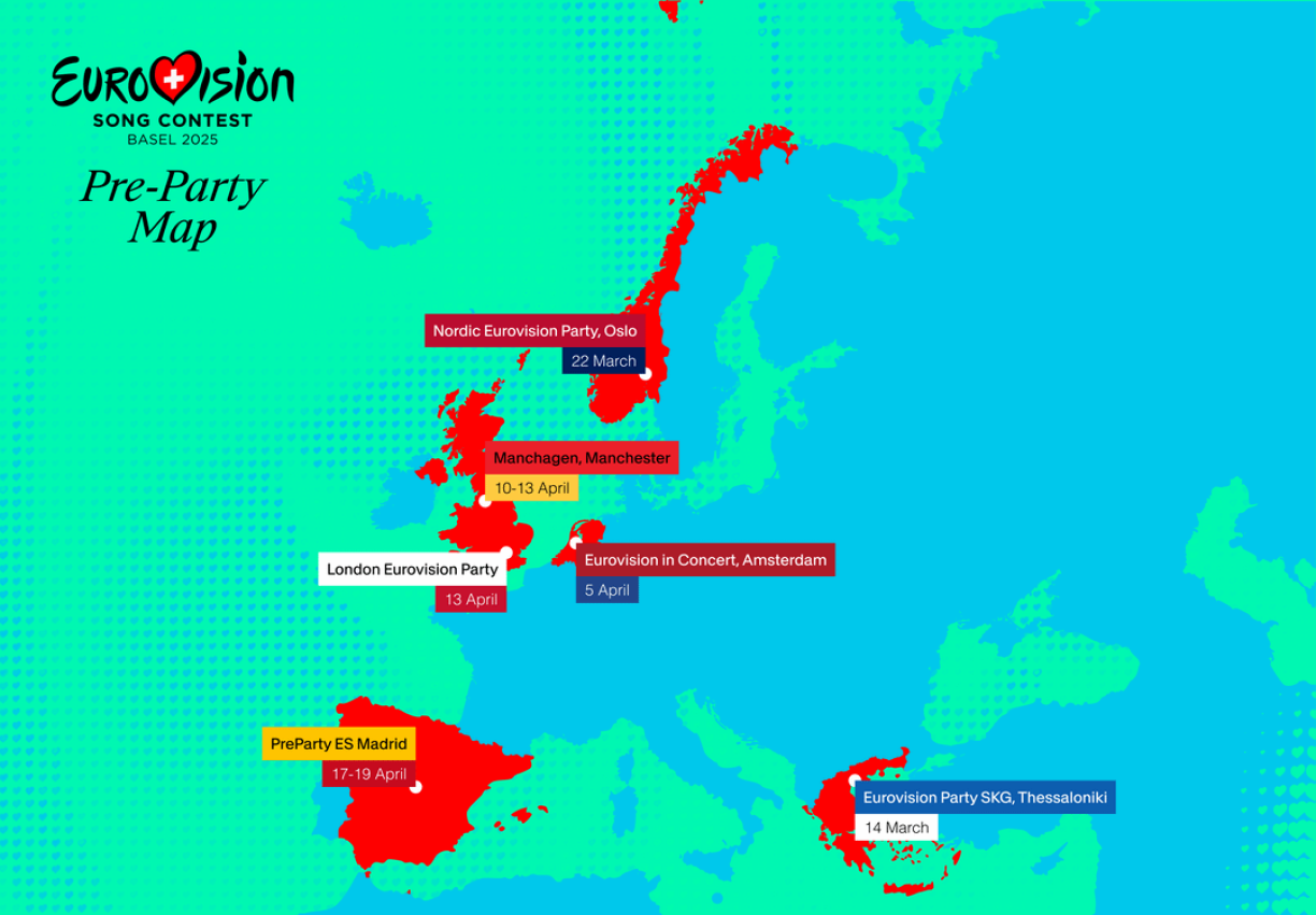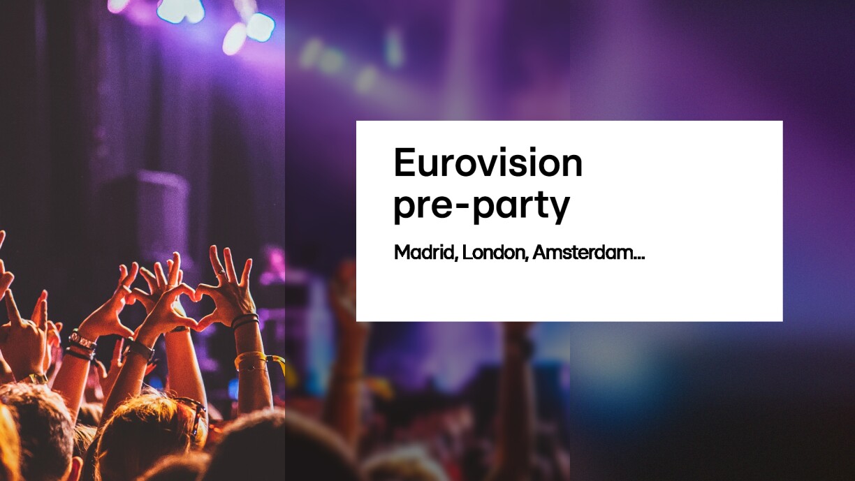 “Eurovision Song Contest"-Pre-Partye fënnt ee wéi gewinnt all Joer queesch duerch Europa verdeelt op e puer vun de bekanntste Metropolen: zu Madrid, London an Amsterdam.