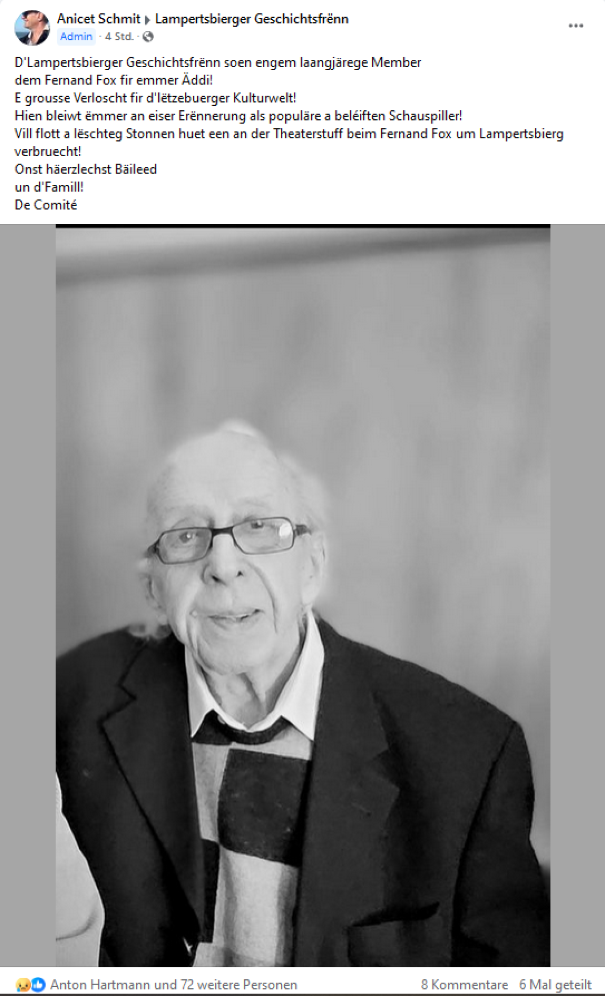 Mat grousser Trauer huet och de Lëtzebuerger Filmfong op déi traureg Noriicht reagéiert a betount, dass de Fernand Fox a grousst Lach an der Lëtzebuerger Konschtwelt hannerléisst.