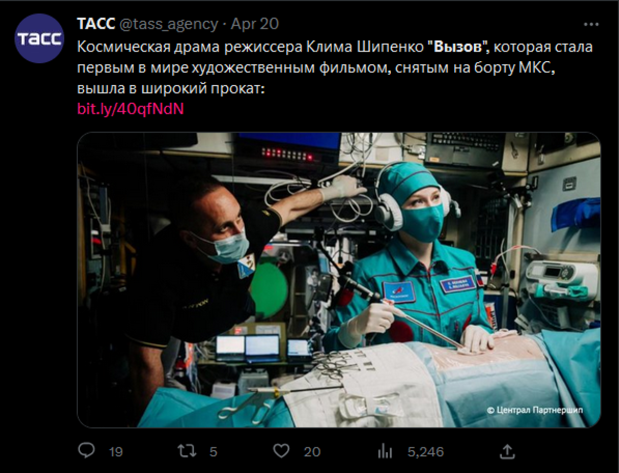De Film mam Originaltitel “Вызов” gouf am Oktober 2021 wärend 12 Deeg op der ISS gedréint. Am Film geet et drëm, datt eng Chirurgin op d’ISS muss fléien, fir e blesséierte Kosmonaut ze operéieren. D’Haaptroll am Film spillt déi bekannt russesch Actrice Julia Peressild, déi och selwer mam Regisseur Klim Schipenko op d’ISS geflu war.