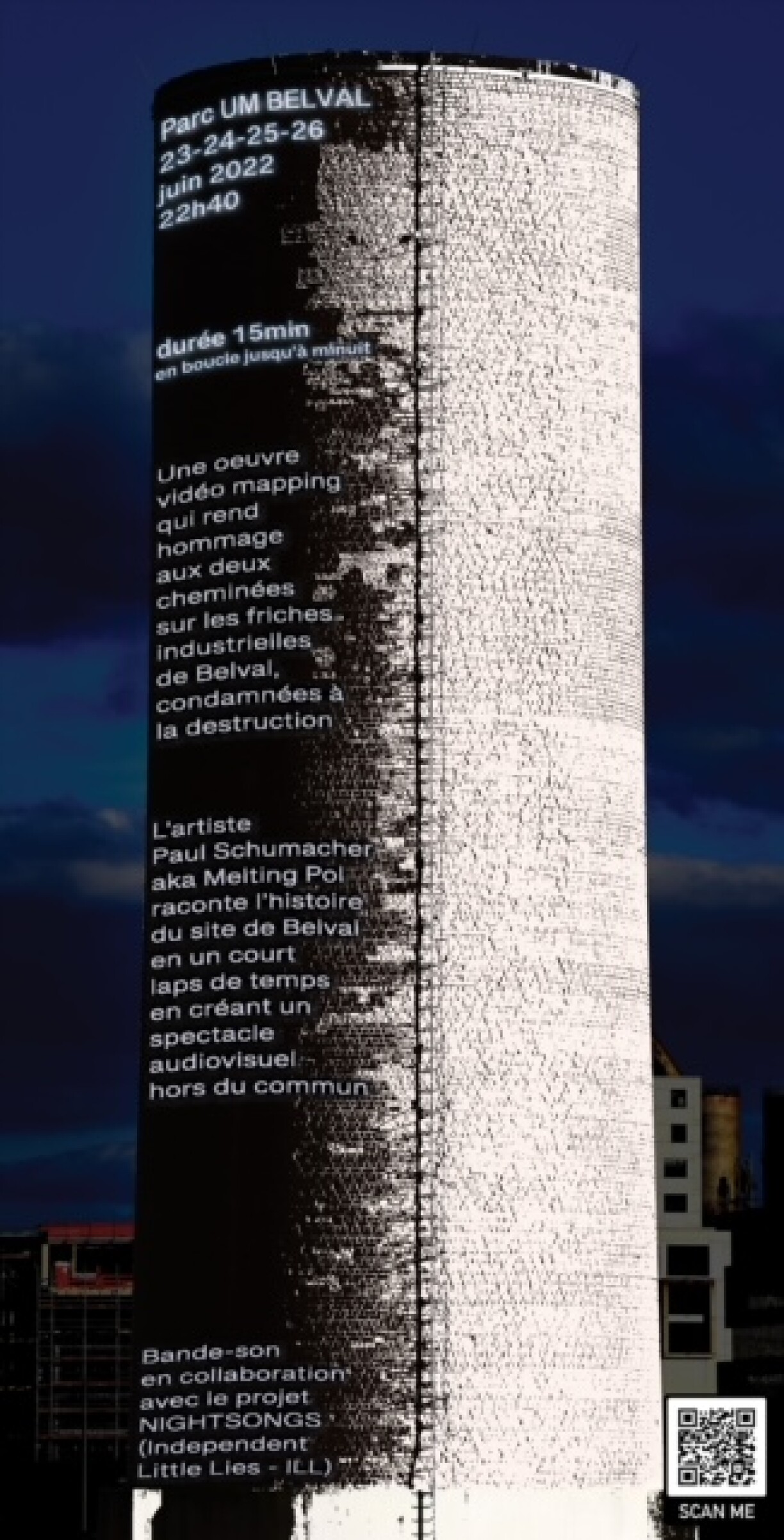 Fir den audiovisuelle Spektakel gëtt op Extraiten aus dem Projet “Nightsongs” zeréckgegraff, d’Atmosphär an d’Ambiance vum Site an der Nuecht waren d’Basis fir elektronech Kompositioune vu Ryvage, Pascal Schumacher a Them Lights.