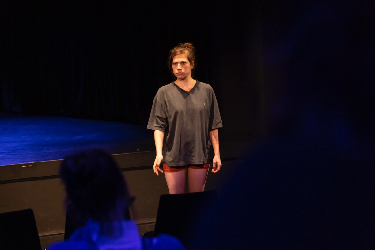 D’Stéck vun der hollännescher Autorin Lot Vekemans ass e rouege Playdoyer fir dës Vue op d’Mënschen, en Text sou kloer an direkt ouni déi grouss Ausféierungen an iwwerméisseg Deklamatiounen. An esou gëtt en och op d’Bün bruecht. “Et muss ee sech an der Regie wansinneg zeréckhalen”, preziséiert d’Regisseurin Anne Simon, dat heescht keng Musek, keng Requisiten an en onopfällege Kostüm: groen T-Shirt, roude Short.