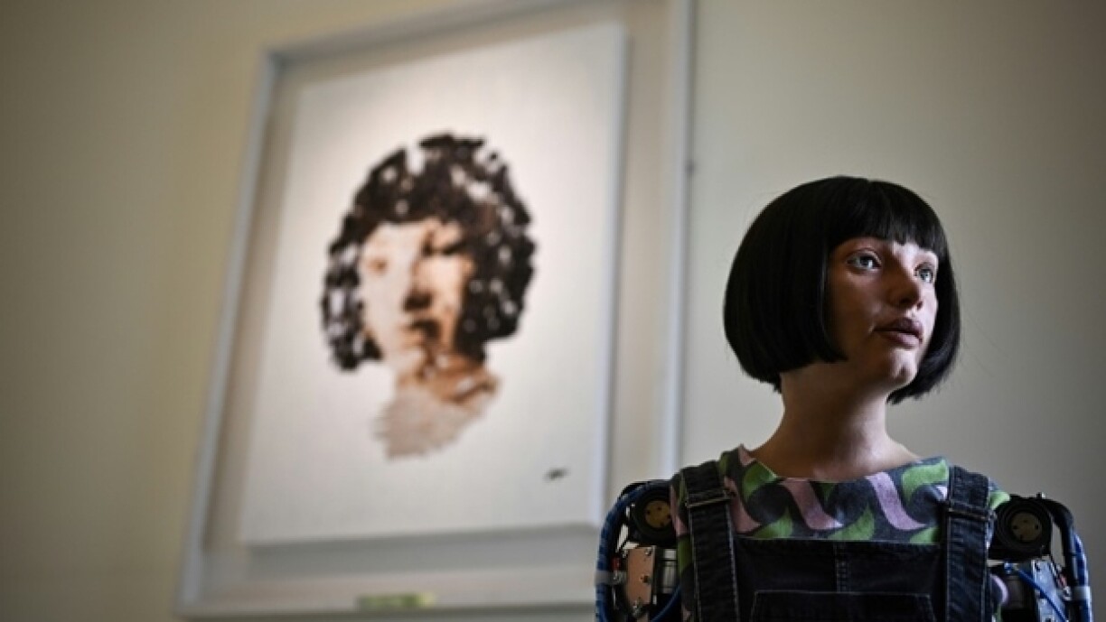 Déi ultrarealistesch Ai-Da gesäit aus wéi eng Fra mat engem bronge Pagekapp a gehéiert zu den am héchsten entwéckeltste Roboteren op der Welt. Si gëtt mat Hëllef vu KI bedriwwen, huet Kameraen an den Aen a bionesch Hänn.