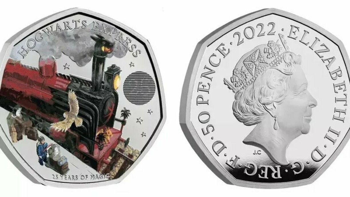 Fir de 25. Jubiläum vun der Publikatioun vum éischten “Harry Potter"-Buch huet d’brittesch Royal Mint e puer Mënze mat Motiven aus der Bicherserie gepräägt. Déi éischt vu véier Sammlermënze goufen e Méindeg presentéiert. Op der enger Säit vun der Mënz am Wäert vu 50 Pence ass d’Damplokomotiv vum Hogwarts-Express ze gesinn, op där anerer Säit e Portrait vun der Queen Elizabeth II.
