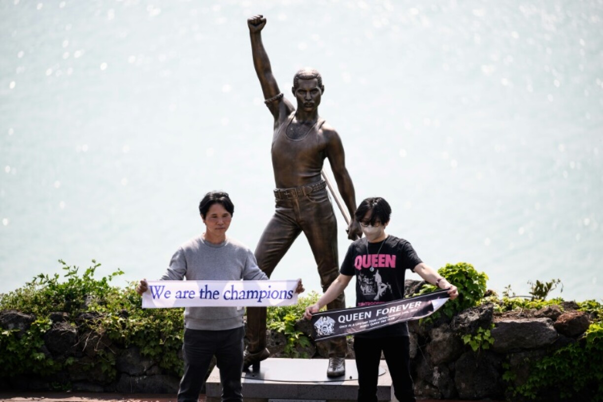 Datt de Freddie Mercury och knapp 31 Joer no sengem Dout nach ëmmer populär ass, beweist d’Tatsaach, datt op engem Bierg op der südkoreanescher Insel Jeju elo eng liewensgrouss Bronzestatue vun him ageweit gouf. Dat 177 Zentimeter héicht Konschtwierk weist de brittesche Sänger, wéi en déi riets Fauscht an d’Luucht streckt.