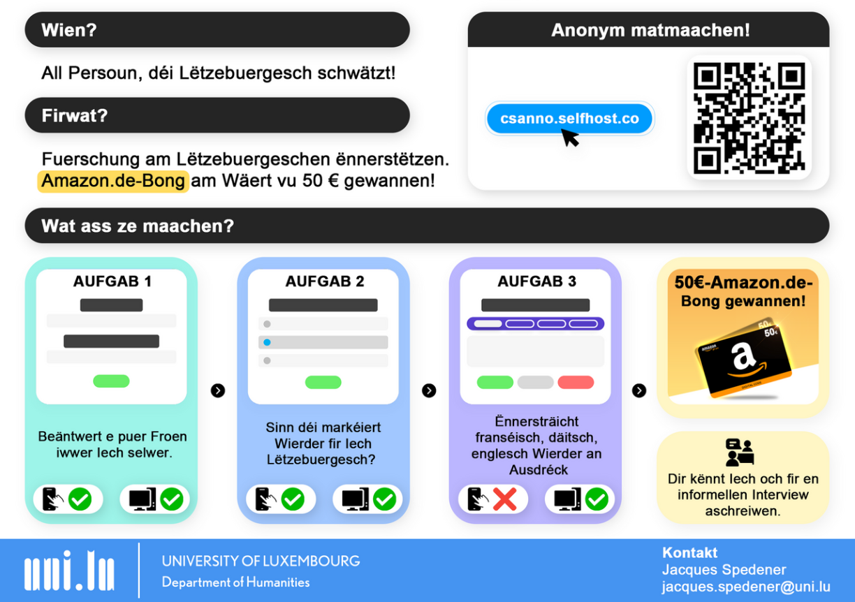 “Lëtzebuerg ass jo bekannt fir seng räich Méisproochegkeet an och multikulturell Gesellschaft, wou et ganz normal ass, an engem Gespréich tëscht verschiddene Sproochen hin- an hierzewiesselen”, dat seet de Jacques Spedener, Doktorand op der Uni Lëtzebuerg. Dee Phenomeen géif een als Sproochewiessel oder Code-Switching bezeechnen. “Mech interesséiert, wéi huele Leit dëse Phenomeen eigentlech am schrëftleche Lëtzebuergesche wouer? Genau dat ënnersichen ech mat menger Fuerschung.”