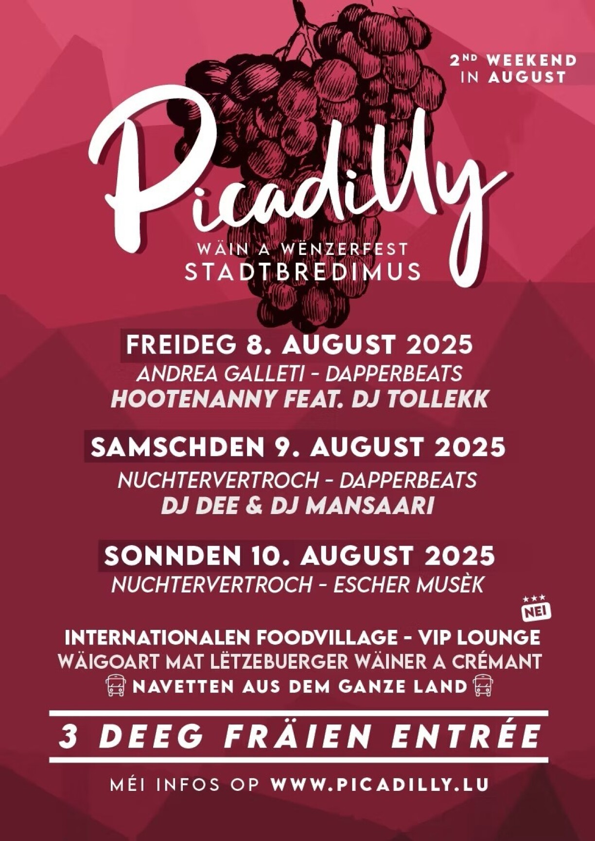 De Picadilly, d’Wäifest ronderëm dat séisst Gedrénks mam nämmlechte Numm, gëtt schonn zanter 68 Editiounen organiséiert. Et ass also eng Traditioun, déi op der Musel net méi ewech ze denken ass. Deementspriechend ass ee beim Syndicat d’initiative vu Stadbriedemes op alles virbereet an d’Preparatioune géife bis ewell gutt verlafen, esou de Michel Marx vun der Organisatioun.