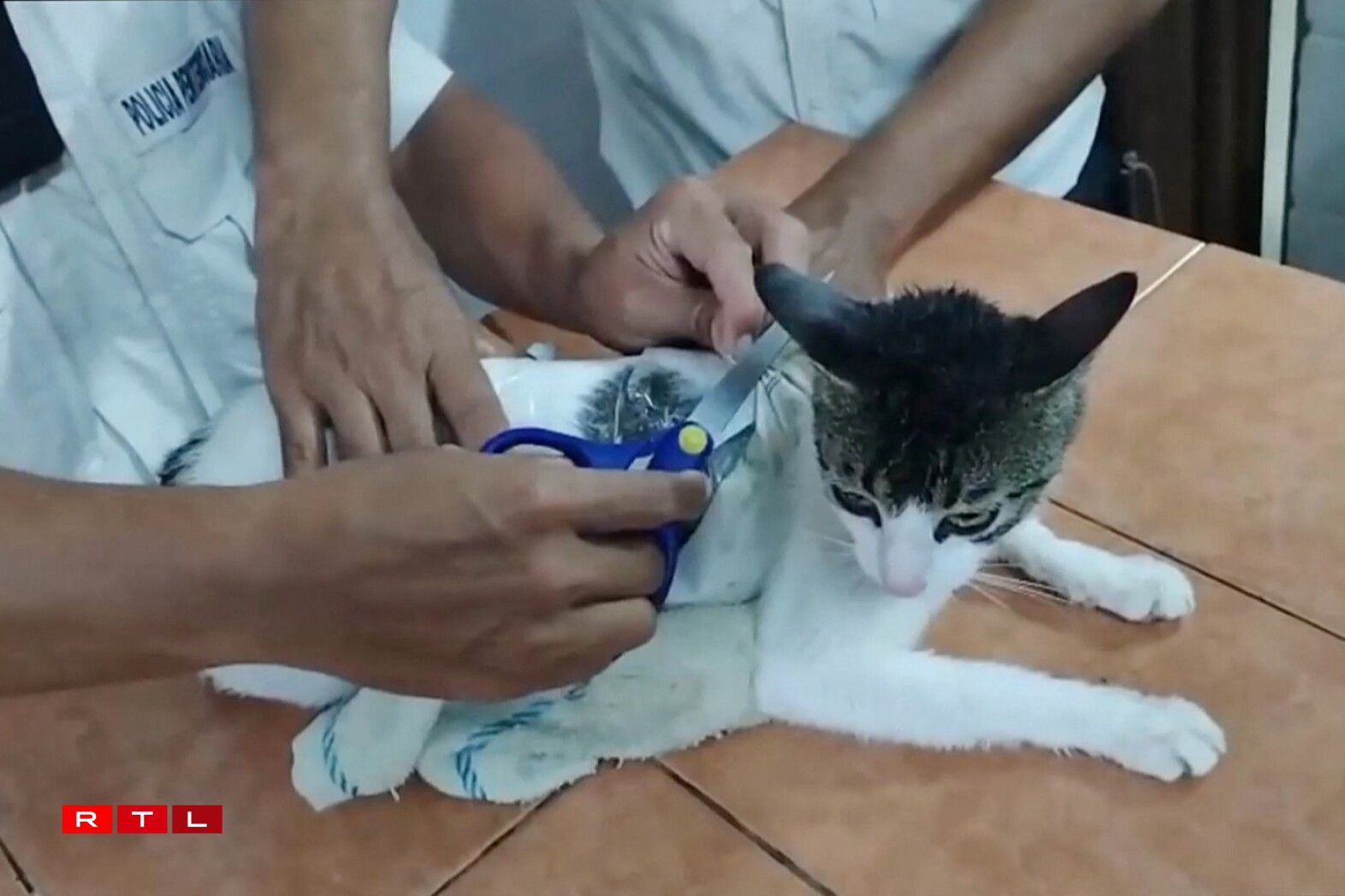 Um Video vum Ministère gesäit een, wéi e Giischtjen iwwer den Zong klëmmt, fir d’Kaz anzefänken. Méi spéit gesäit een d’Kaz op engem Dësch am Prisong, wärend d’Giischtercher d’Päck vu sengem Kierper erofschneiden. D’Kaz koum dono bei en Déiereschutzveräin.