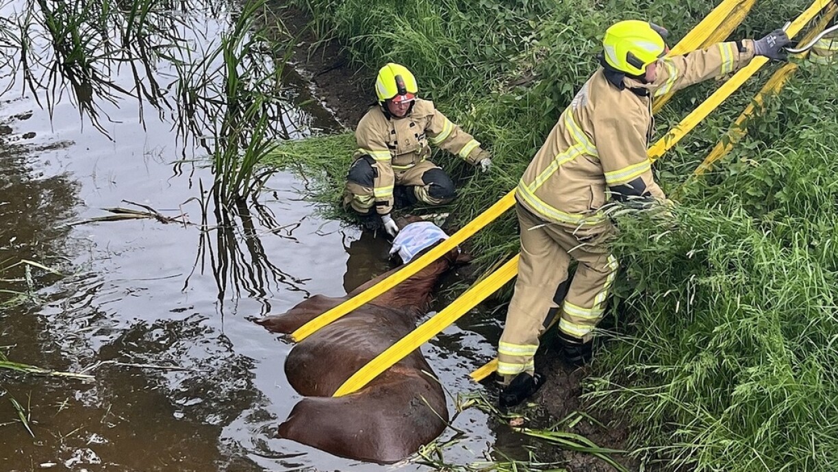 E Päerd war an ee Gruef gefall a koum aus dem naasse Lach vum selwen net méi eraus. Géint 16 Auer war de Pompjeeën en ‘“Déier an Noutlag” gemellt ginn. Op der Plaz hu si d’Päerd am Gruef fonnt. D’Déier war um Enn vu senge Kräften. Fir et aus dem Waasser ze zéien huet en Déierendokter, dee scho virun de Pompjeeën op der Plaz war, d’Päerd misse déiden.