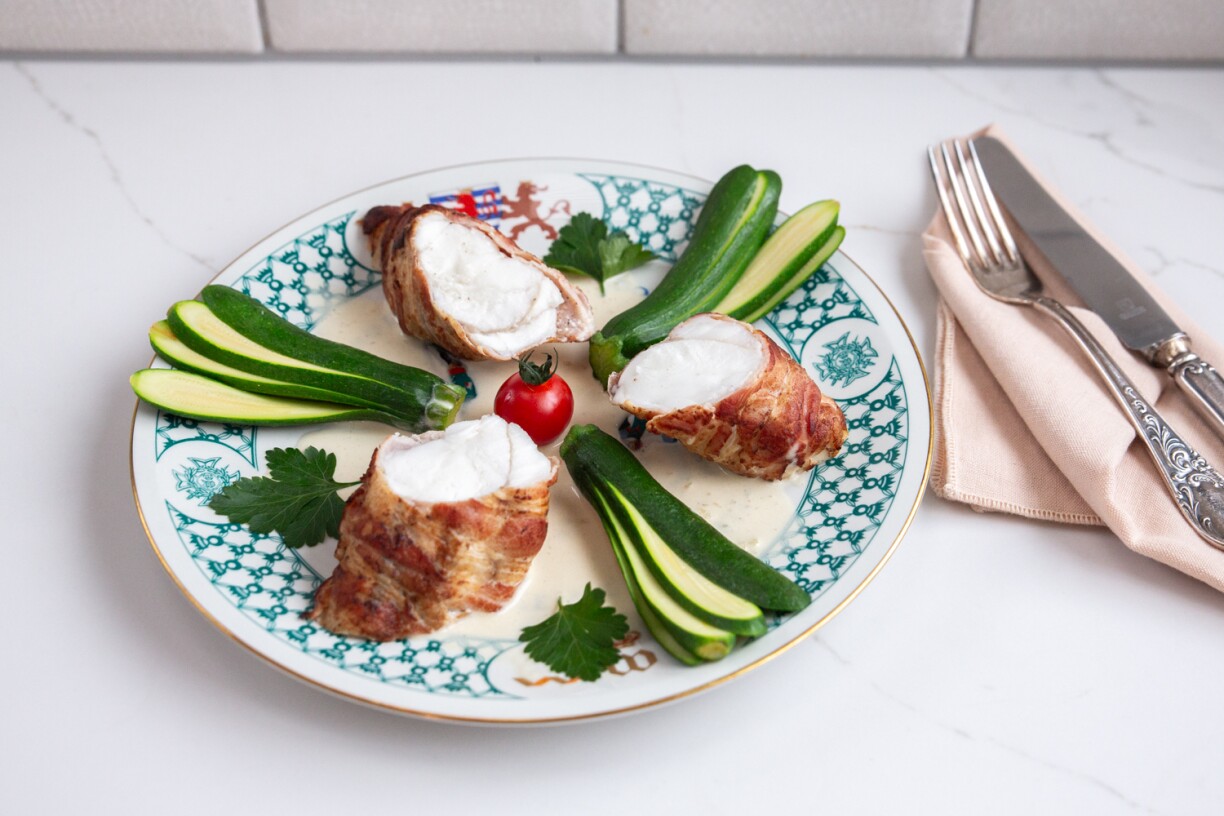 D’Speckscheiwen op engem Stéck Frischhaltefolie ausleeën, sou dass se sech liicht iwwerlappen. D’Lotte mat Salz a Peffer wierzen an op de Speck leen. Dat Ganzt fest arullen, da ficeléieren.
