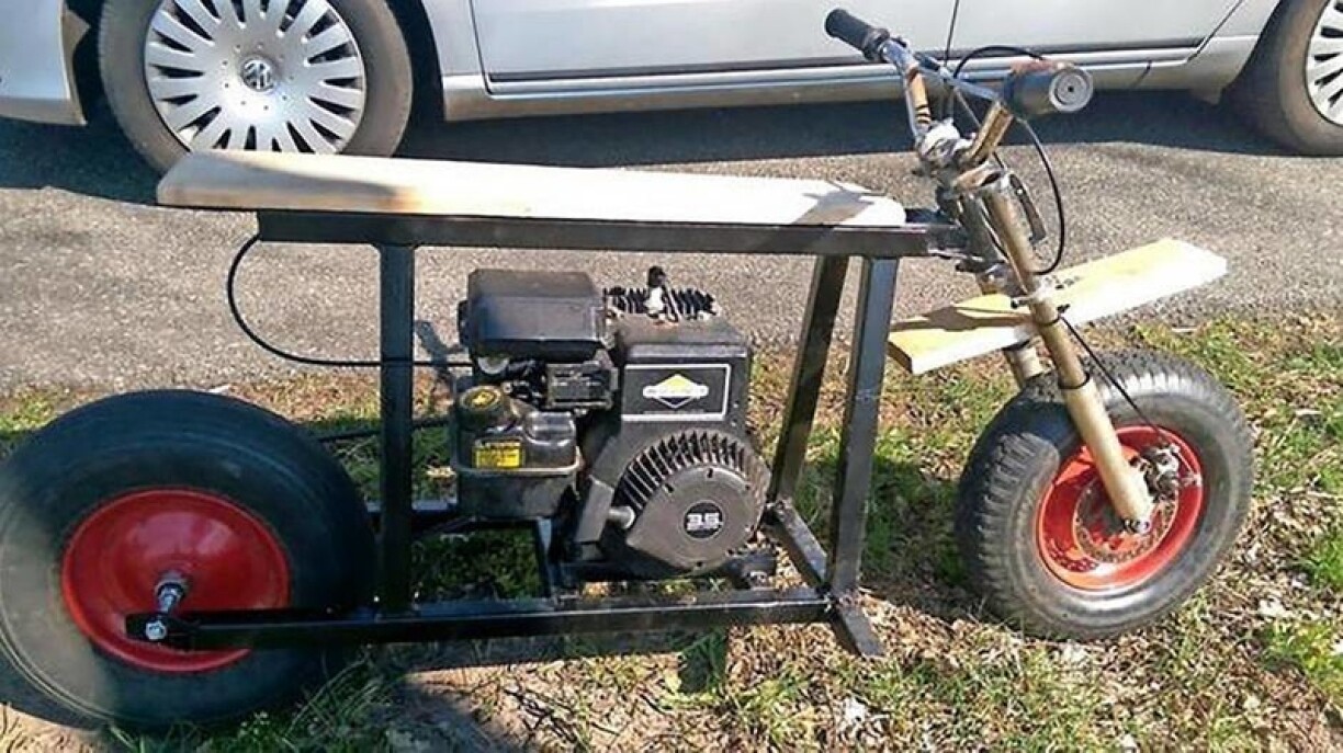 Hie war mat engem Motorrad ënnerwee, datt kloer “Marke Eigenbau” war: E Sëtz aus Holz, e Moto vun enger Aart Méimaschinn, d’Rieder vun enger Schubkar an e Gerüst aus Metall. Assurance an och Pabeieren hat d’Gefier och keng.