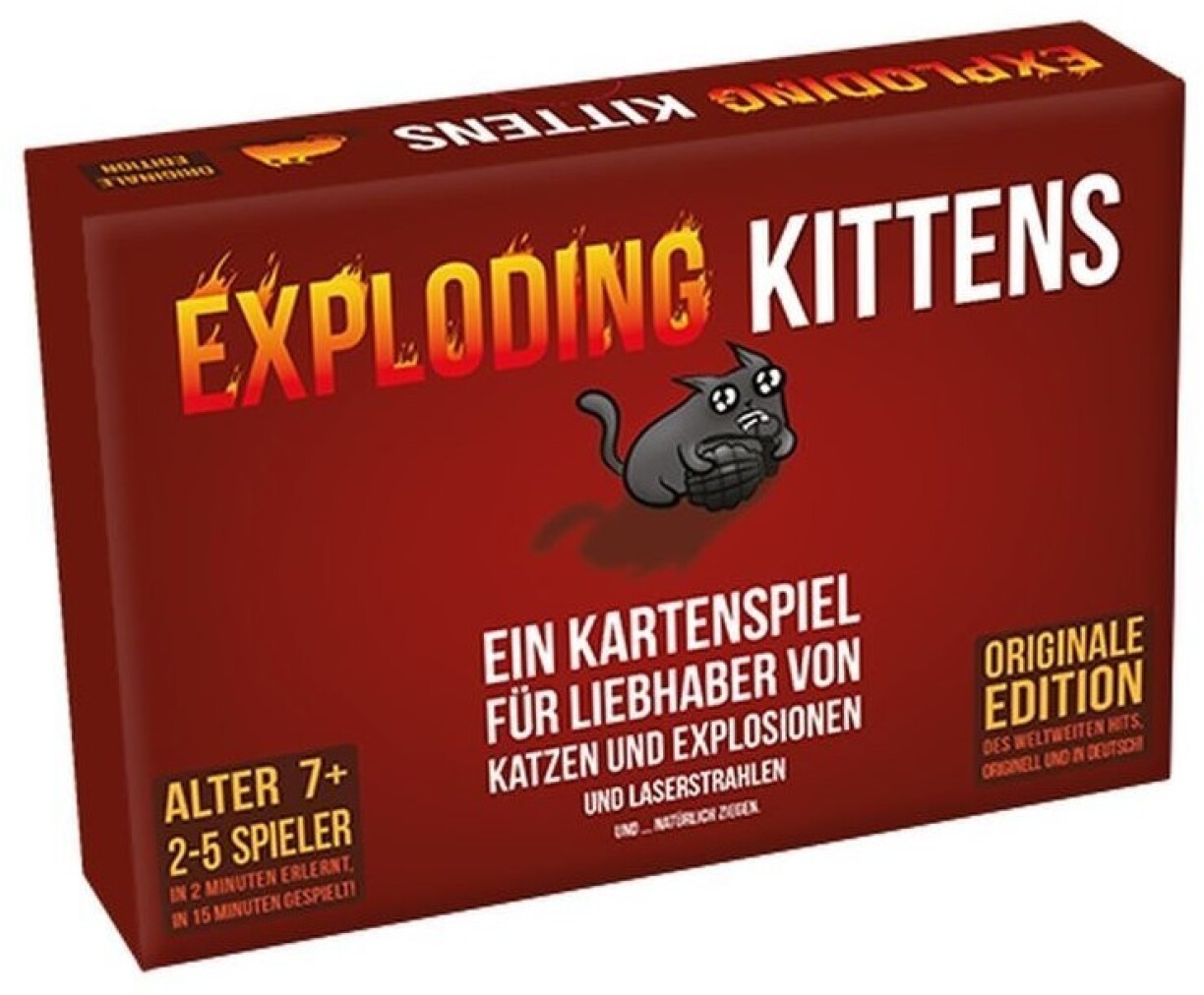 Beim Kaartespill „Exploding Kittens” geet et héich explosiv hir - eng taktesch Versioun vu Russesch Roulette, just ebe mat Miissercher amplaz vu Patrounen. D’Spiller zéien een nom anere Kaarte vun engem Koup, bis een eng „Exploding Kitten” zéit. Deejéinegen „explodéiert” a scheet direkt aus. Et sief dann, en huet eng Entschäerfungskaart. Mat dëser kann een nämlech d’Miissche berouegen, vum Explodéieren ofhalen an esou an der Partie bleiwen. Gespillt gëtt sou laang, bis just nach een, nämlech de Gewënner iwwreg ass.