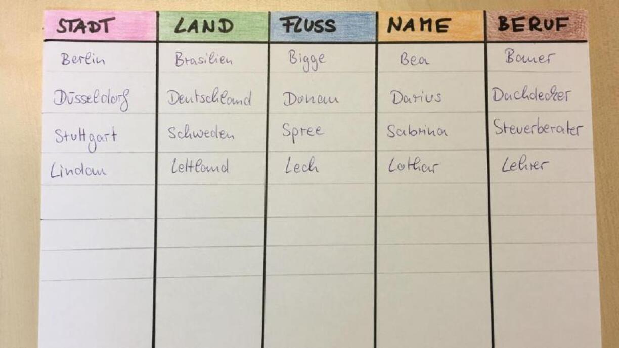 Wéi heescht d’Haaptstad vu Kroatien? Wéi eng Faarwen huet de Fändel vun Argentinien? Wéi een ass dee längste Floss vun der Welt? Mam Klassiker „Stad, Land, Floss” kann een, wéi den Numm et scho seet, säi Wëssen iwwer d’Stied, d’Länner an d’Flëss vun eiser Äerd testen. Pro Ronn gëtt e Buschtaf aus dem Alphabet ausgesicht, zum Beispill andeems ee Spiller a Gedanken d’Alphabet opzielt an en anere “Stopp” rifft. Da mussen déi eenzel Spiller fir all Kategorie ee Begrëff fannen, dee mam gewielte Buschtaf ufänkt. Soubal deen Éischten all d’Kategorien ausgefëllt huet, mussen déi aner Spiller ophale mat schreiwen an d’Begrëffer gi verglach. Déi meeschte Punkte ginn et fir dee Spiller, deen als eenzegen e Wuert fir eng Kategorie fonnt huet.