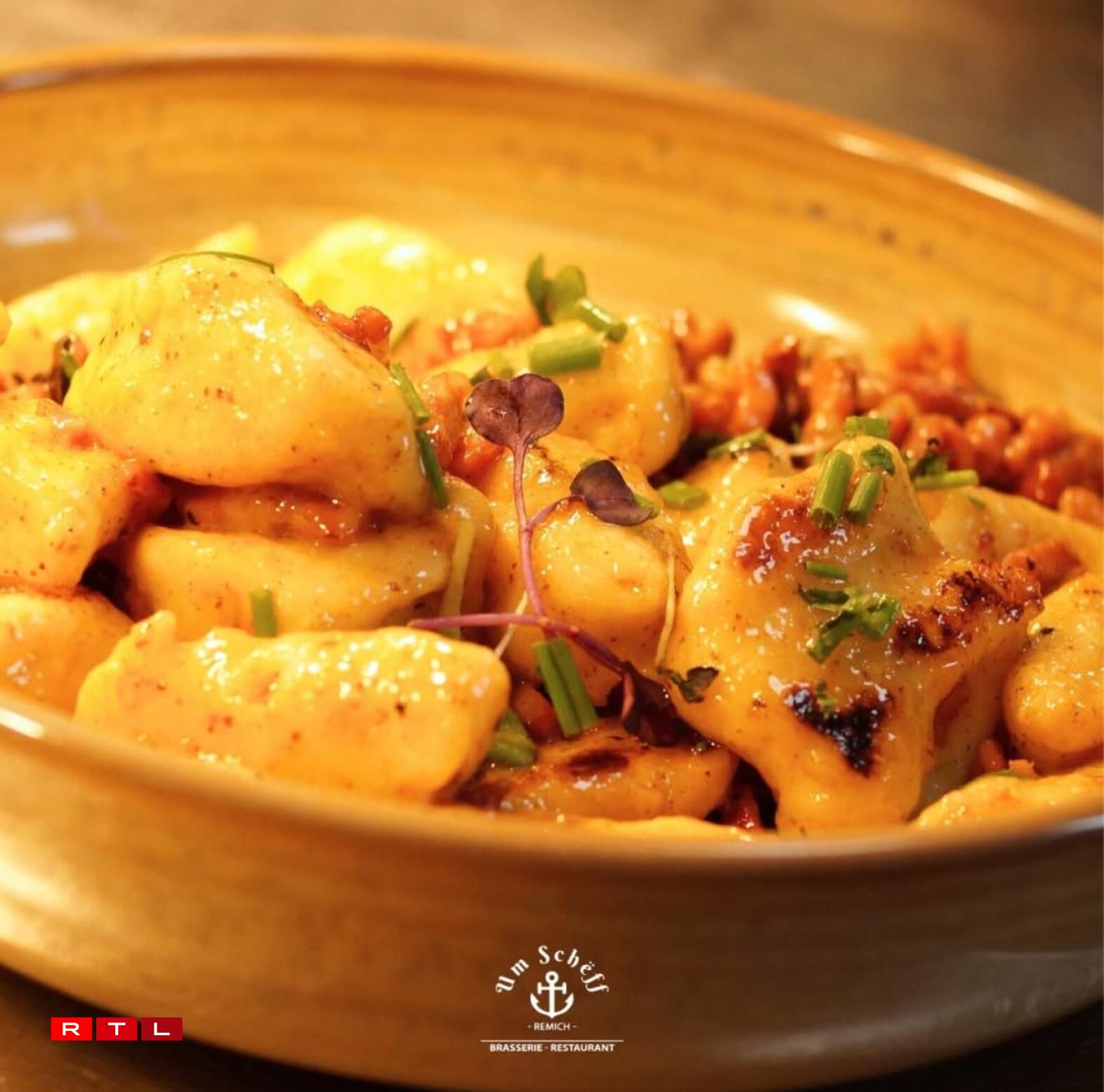 Fir d’Plaz 4 verschléit et eis dann un d’Musel an den Oste vum Land, nämlech op Réimech. Matten am Zentrum, net wäit vun der Esplanad, mécht den “Um Schëff” den Eck. Definitiv net z’iwwersinn, wann een zu Réimech ass. Dem Maurice Neuser, Patron an och Kichechef, gehéiert den “Um Schëff” (an iwwregens och den “D’Brutzel Schëff” direkt niewendrun), dat zesumme mat sengen Associéeën Timo Studer an Dan Studer.