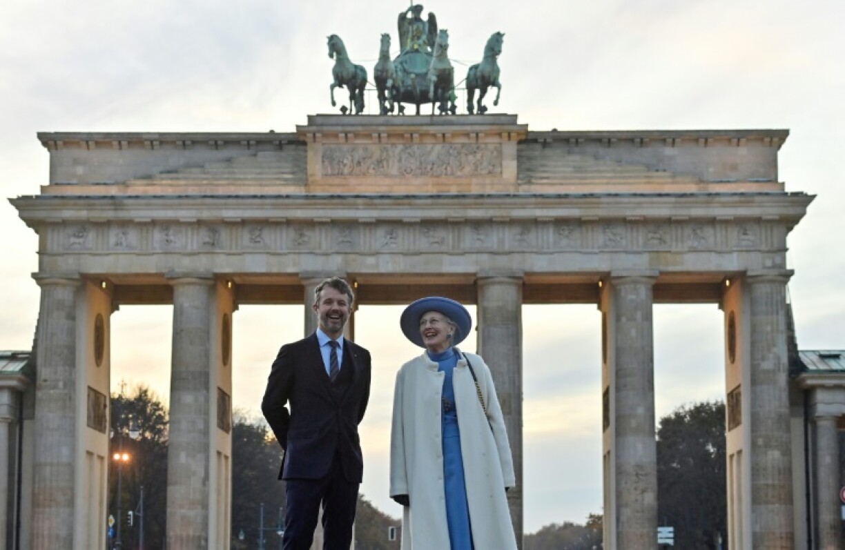 E Mëttwoch de Moien ass déi 81 Joer al Monarchin um militäreschen Deel vum Berliner Fluchhafe gelant. Mat engem häerzleche Laache sti sech kuerz drop béid Powerfraen, Angela Merkel a Kinnigin Margarethe, géintiwwer.