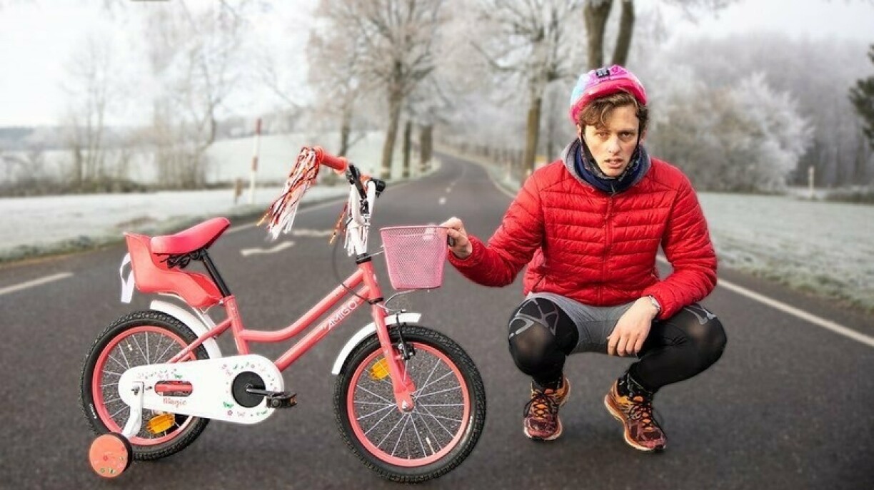 Gesot, gemaach... De Max Fosh ass bis op déi belsch Grenz gereest, sech an engem Spillgeschäft e Vëlo mat Riedercher an e rosa Kannerhelm kaf, a lass goung et. De Plang war et vu Maarteleng aus ze starten, ronn 50 Kilometer vum Westen an den Osten duerch de Grand-Duché ze fueren, fir dann zu Bollendorf unzekommen. Leider huet hie sech fir dës Rees dee keelsten Dag aus dem Joer ausgesicht an huet och net beduecht, dass et dann dach net sou einfach ass als erwuessene Mann op engem Kannervëlo virun ze kommen.