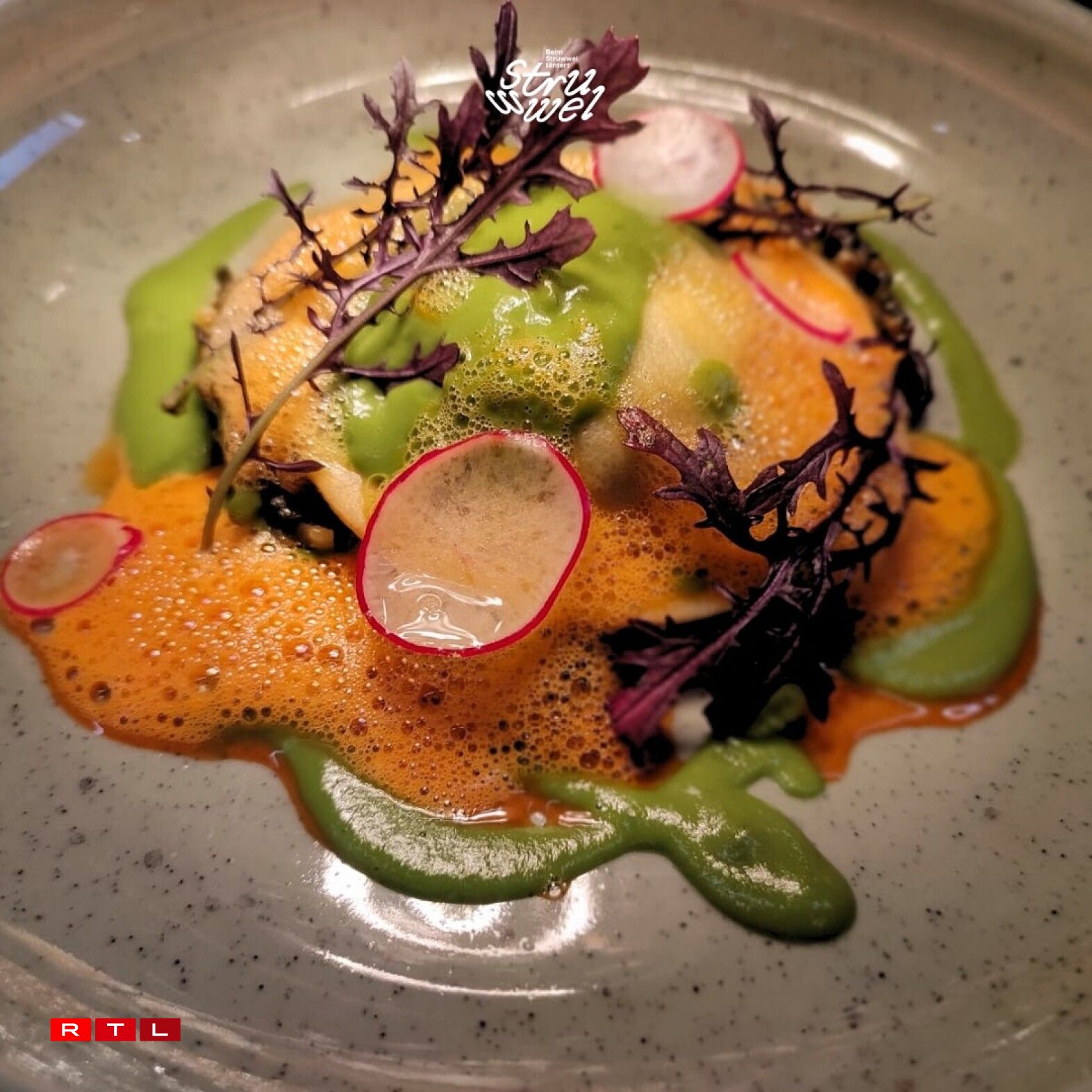 “Regional”, “saisonal” a “bio”. Alles Kär-Elementer, op déi een sech astelle muss, wann ee bei de Joran Didelot, Patron a Kiche-Chef vum “Struwweltëntert”, iesse geet. Dat wat een am Gaart fënnt, fënnt een an dësem Restaurant zu Tënten och um Teller, esou kann een d’Konzept zesummefaassen. Orangen aus Spuenien beispillsweis fënnt een hei ganz kloer net. Hei gëtt zu 98% alles selwer gemaach, vum Brout, zu de Raviolien bis hin zu der Glace. De Choix am Restaurant huet een tëscht 4 verschiddenen Entréeën, Platen an Desserten, an déi changéieren och all Mount. A vun dëse véier Optiounen, wier de vegetaresch Optioun déi, déi all Kéiers mat vir bäi ass bei de Bestellungen, dat géif ee kloer mierken. Dëse Mount ginn et mat verschiddene Champignone gefëllte Cannelonien an Ierbessen an engem Bouillon, déi kéinte souguer d’Nummer 1 vum Juli ginn.