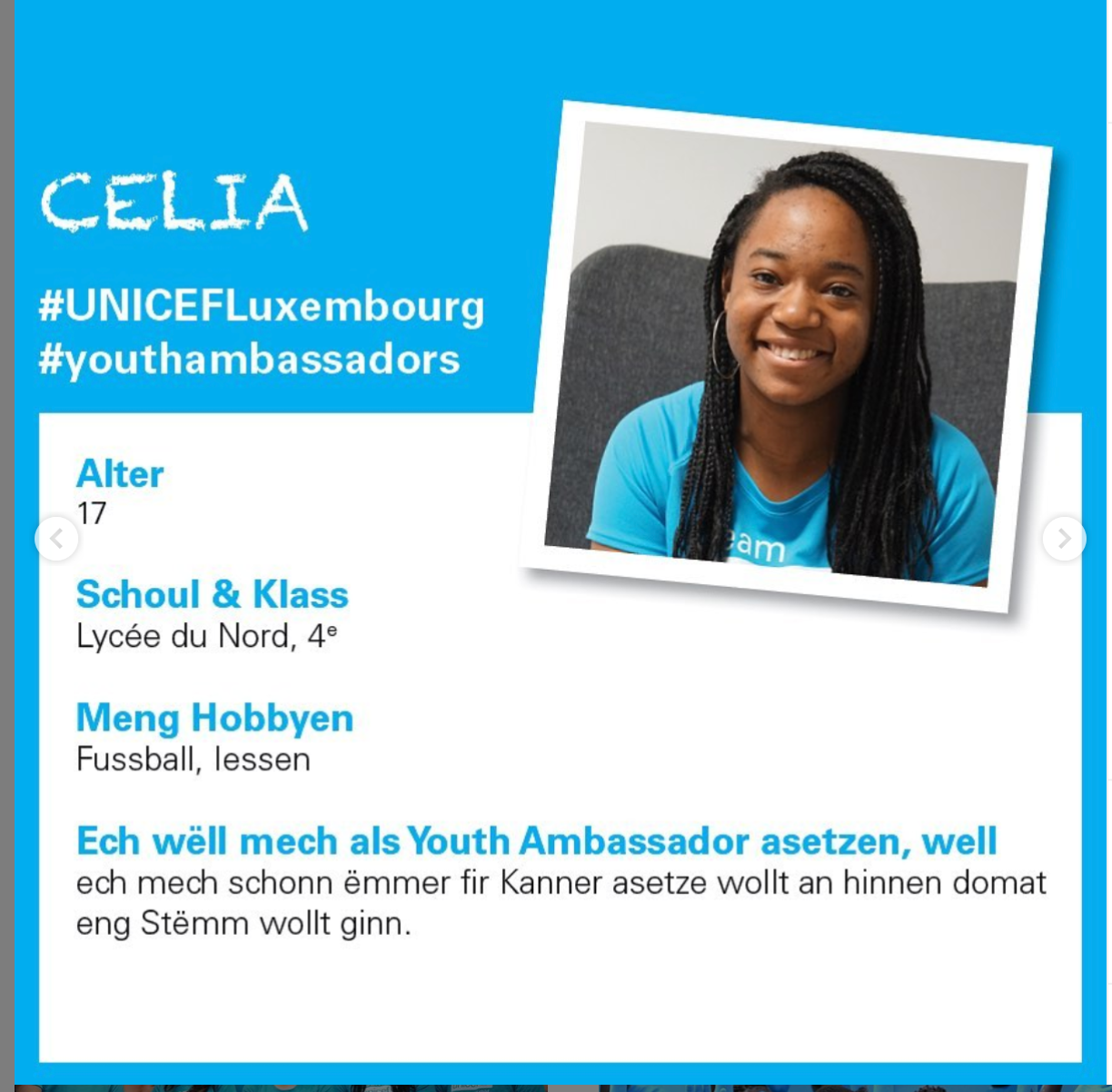 D’Celia Gaul kënnt aus dem Éislek an ass op enger 4e am Lycée du Nord zu Wolz. A senger Fräizäit spillt d’Celia Futtball a mécht Radio. Um Weltkannerdag ass et awer a senger Funktioun als Unicef-Ambassadrice bei eis, wou et wéi seng 14 Kolleegen de Kanner eng Stëmm wëll ginn. Kanner ginn dacks ënnerschat an hunn och hir Rechter an dofir setzt d’Celia sech an. Leider huet och de Covid den Unicef-Ambassadeuren e Stréch duerch d’Rechnung gemaach a vill Aktivitéite goufe verréckelt oder ofgesot.