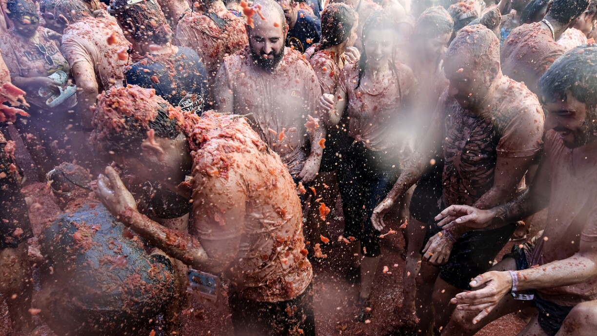 No zwee Joer Corona-Paus war et nees esou wäit. Dat beléiften “Tomatina"-Festival am spuenesche Buñol huet säi Comeback gefeiert. Mëttelpunkt vum traditionellen Event war eng Tomate-Schluecht. E Mëttwoch hu sech eng 15.000 Persoune mat 130 Tonnen Tomate beworf. Fir hir Ae viru Sprutzen ze schützen, haten eng Abberzuel Leit e Sonnen- oder Taucherbrëll un.