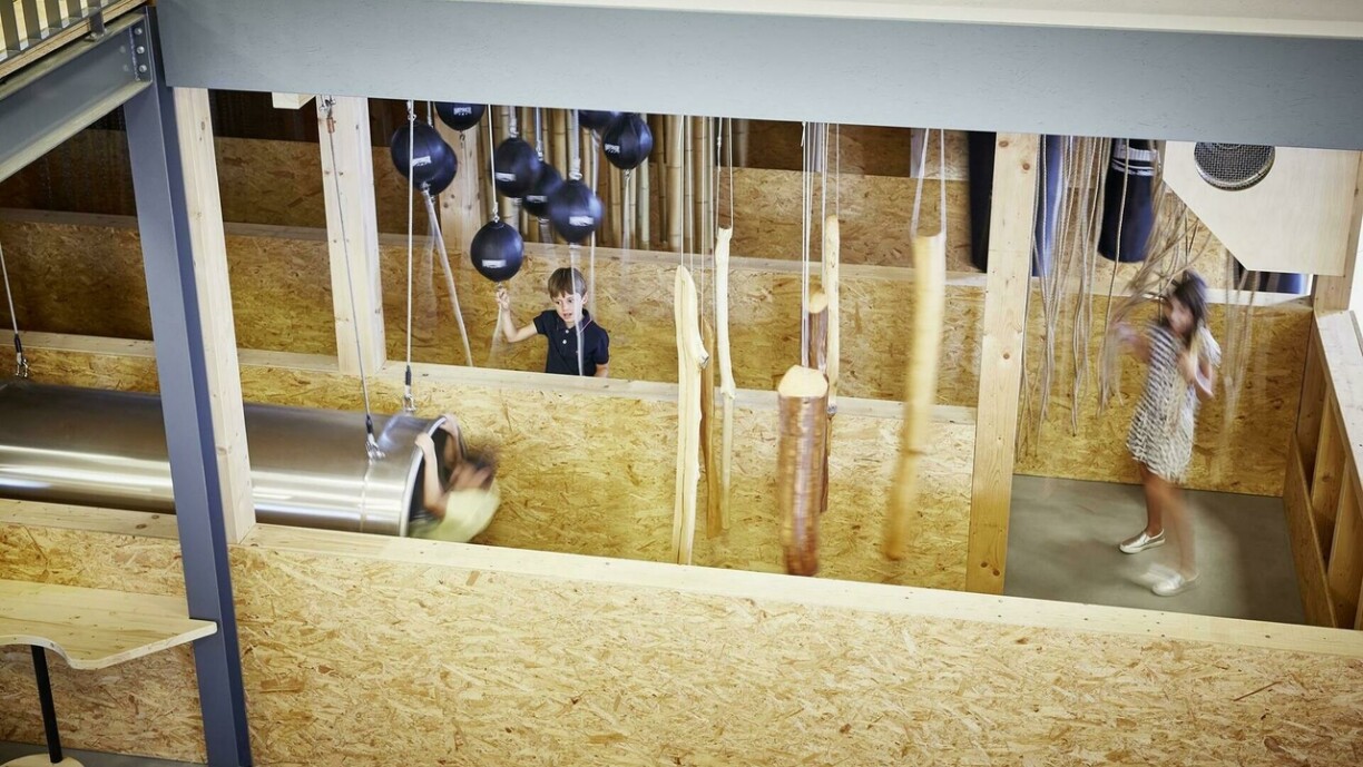 “Da befënnt sech awer och am Banneberäich en Airtramp. Fir all déi, deenen en Airtramp elo kee Begrëff ass: en Airtramp ass e grousst loftgefëllte Këssen, an eisem Fall vun 10 op 10 Meter, änlech wéi e groussen Trampolin. A schlussendlech befënnt sech dann och e Restaurant, de Bistro Sënnesräich, deen op regional a saisonal Produite setzt, am Gebai.”