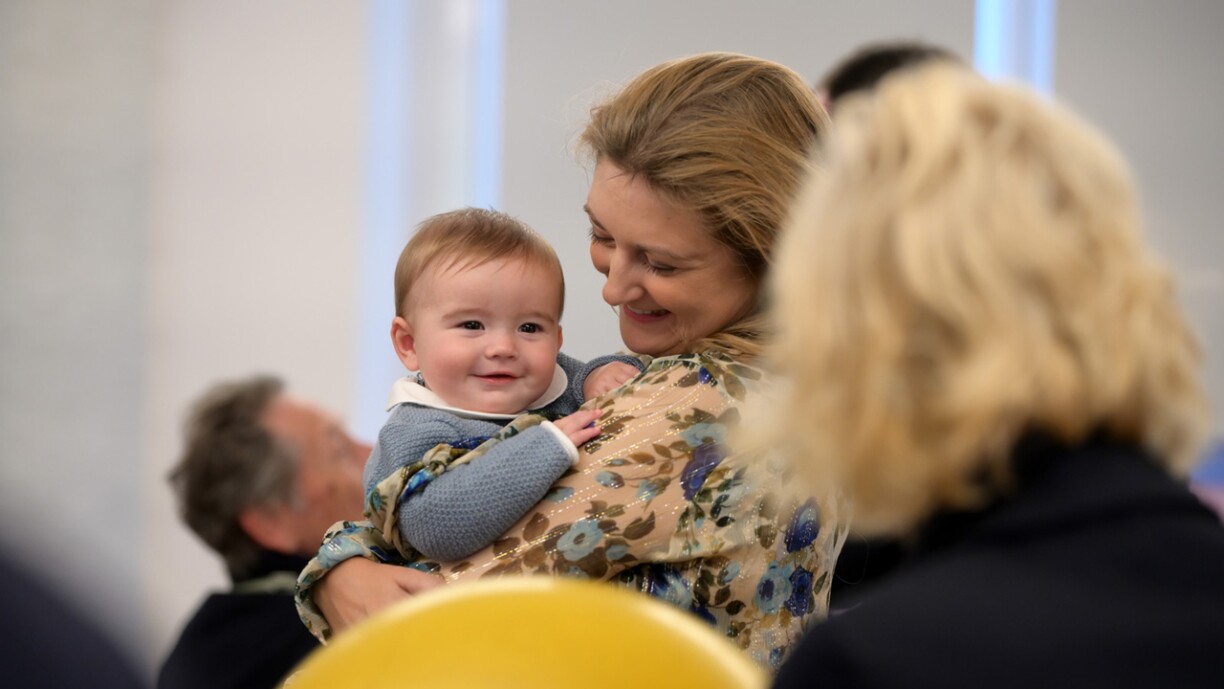 Den Haff huet en Donneschdeg Fotoe vun der Visitt op de soziale Medie publizéiert. Fir eng éischte Kéier schéngt de klenge Prënz sech a senger Roll scho ganz wuel gefillt ze hunn. Hien huet de Bewunner, déi sech sichtlech iwwert de Besuch gefreet hunn, gelaacht a grouss Ae gemaach.