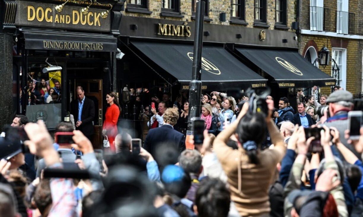 D’Kate sot, hiren eelste Fils, de Prënz George, wier ganz opgereegt wéinst der Kréinung. D’Koppel gouf virum Pub vu sëllege Spectateuren empfaangen, si hunn Hänn gerëselt a mat de Mënschen op der Plaz geschwat.
