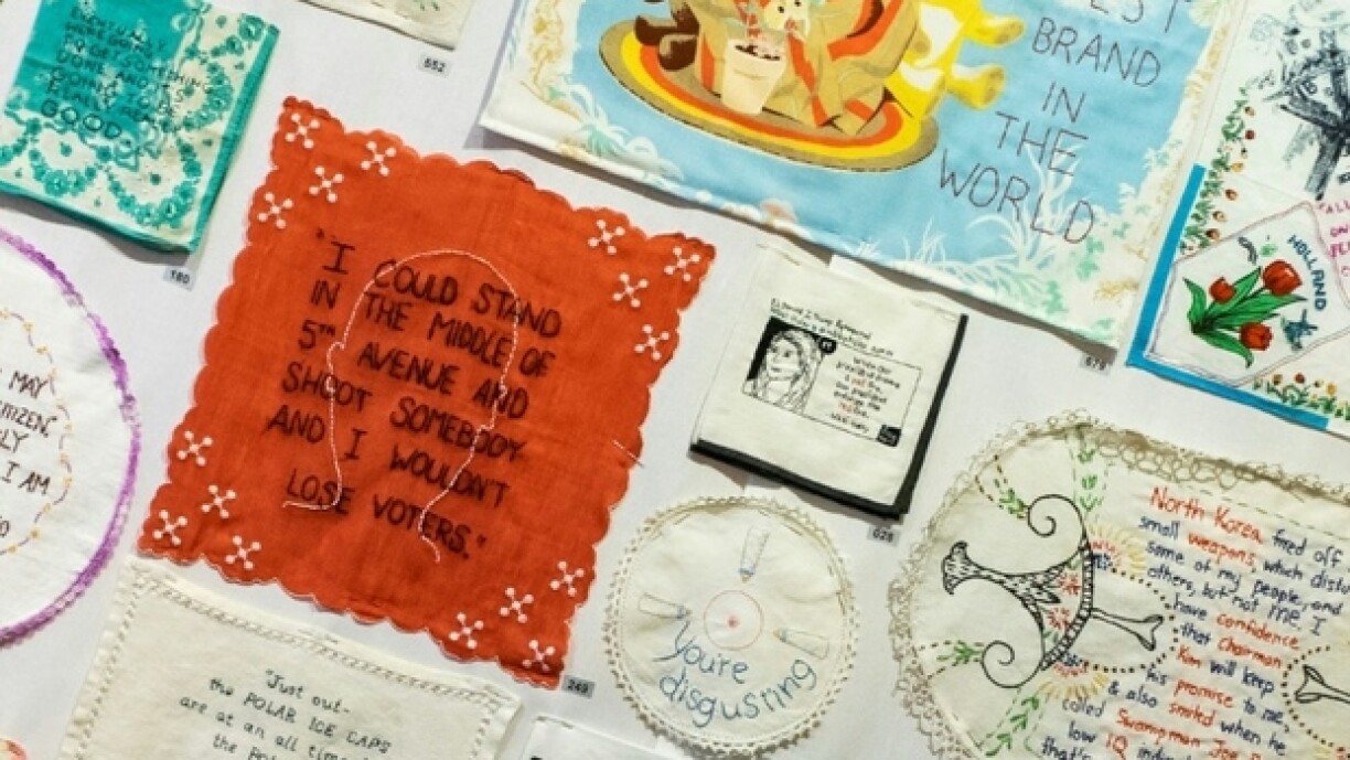 “Such a nasty woman”, “Crooked Hillary”, “Grab’em by the pussy”. Dat sinn nëmmen e puer vu villen Zitater, woufir den Trump scho Kritik kritt huet. D’Amerikanerin Diana Weymar huet eng Kollektioun vu ronn 900 vun dësen Zitater, déi all op Stoff gestéckt goufen.