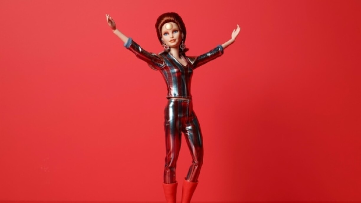D’Popp, zu Éiere vum bekannte Sänger, kënnt um 50. Joresdag vum David Bowie senger legendärer Single “Space Oddity” eraus, dat war 1969. D’Barbie huet ee gesträifte Costume mat metallesche Faarwen a rout Plateau-Stiwwelen un. Mattel wëll dat “kulturellt Ierwen vum musikalesche Genie” éieren.