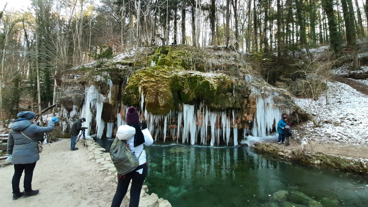 Duerch déi äiseg Temperature vun de leschten Deeg huet d’Kallektuffquell sech an e wonnerbaart Naturspektakel verwandelt. Op dëser Plaz leeft staarkt kallekhaltegt Waasser iwwert e Fielsvirsprong. D’Sonnestralen an d’Äiszapen hunn d’Bild fir sou munche Fotograf perfektionéiert.