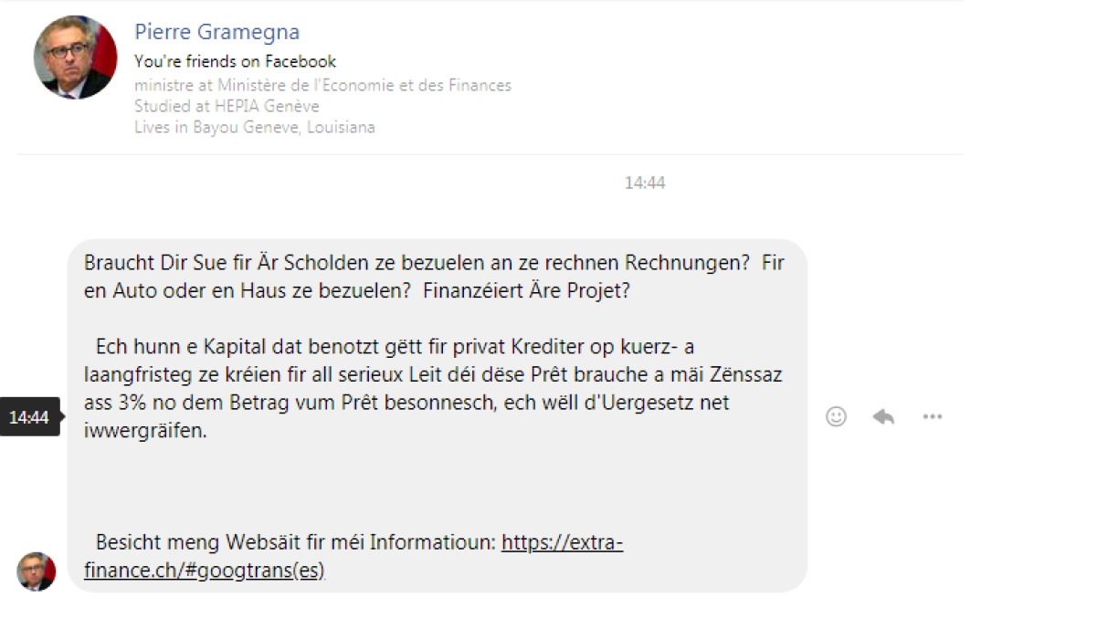 Et ass e Fake-Profil op Facebook, datt sech d’Foto an den Numm vum Lëtzebuerger Finanzminister ugëeegent huet an esou falsch Meldungen un aner User schéckt. Also an dësem Fall net reagéieren, maximal eng Kéier schmunzelen, d’Profil bei Facebook mellen an de Message läschen. Awer op kee Fall op de Link klicken...