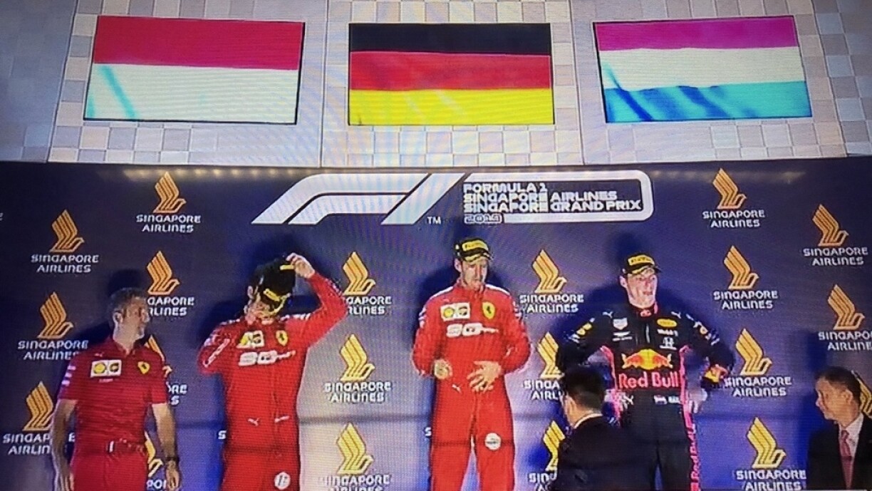 Do ass e Sonndeg wuel eppes schif gelaf. An der Formel 1 gouf bei der Präisiwwerreechung vum Grousse Präis vu Singapur de lëtzebuergesche Fändel ageblennt. Mam Max Verstappen stoung awer kee Lëtzebuerger als Drëtten um Podium, mä villméi een Hollänner.