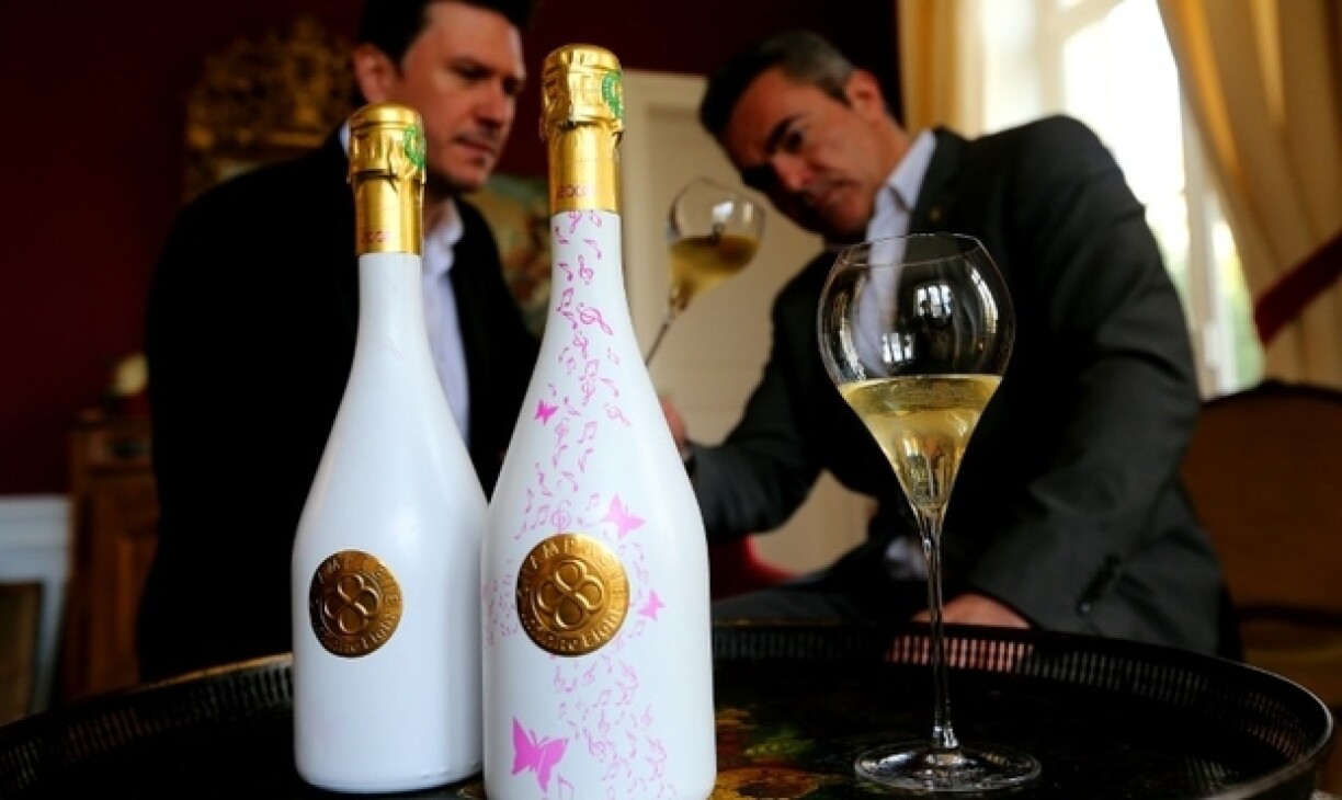 Déi wäiss Fläsch verännert hir Faarf soubal de Contenue, also de Schampes kal genuch ass, fir gedronk ze ginn. D’Folie vum Infinite-Eight-Schampes aus Ville-Dommange bei Reims ass am Ufank ganz wäiss, ass e kal, gesäit een e Muster aus rosa Nouten a Päiperleken.