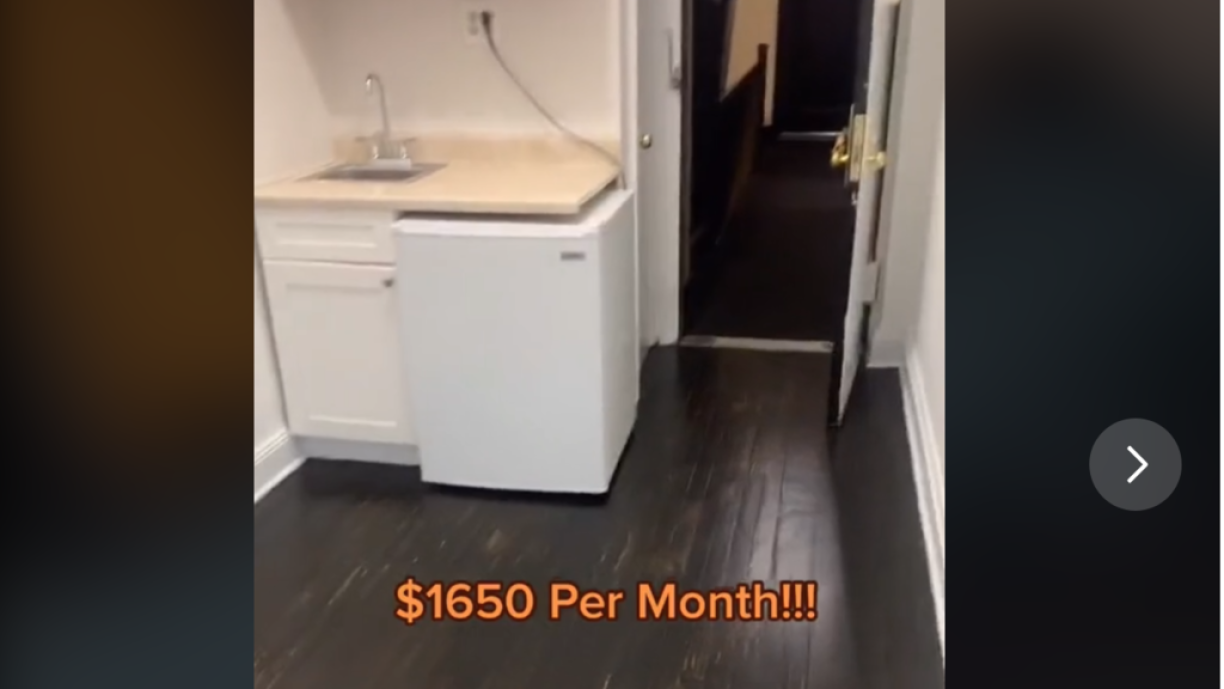 De Video weist eng extrem kleng Wunneng mat nëmmen engem Raum, ouni Buedzëmmer an enger klenger Kichen, ouni Schäffchen. Toilette an Dusch sinn och net an der Wunneng, mä baussen am Gank, a gi schéi brav mat den anere Locataire gedeelt. An dat fir “läppeg” 1.650 Dollar, also 1.370 Euro de Mount. Allerdéngs wunnt een dann an der populäerster Géigend vu New York.
