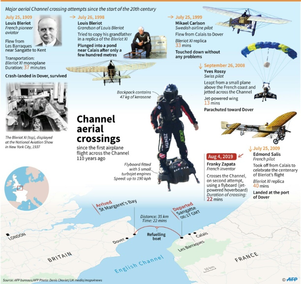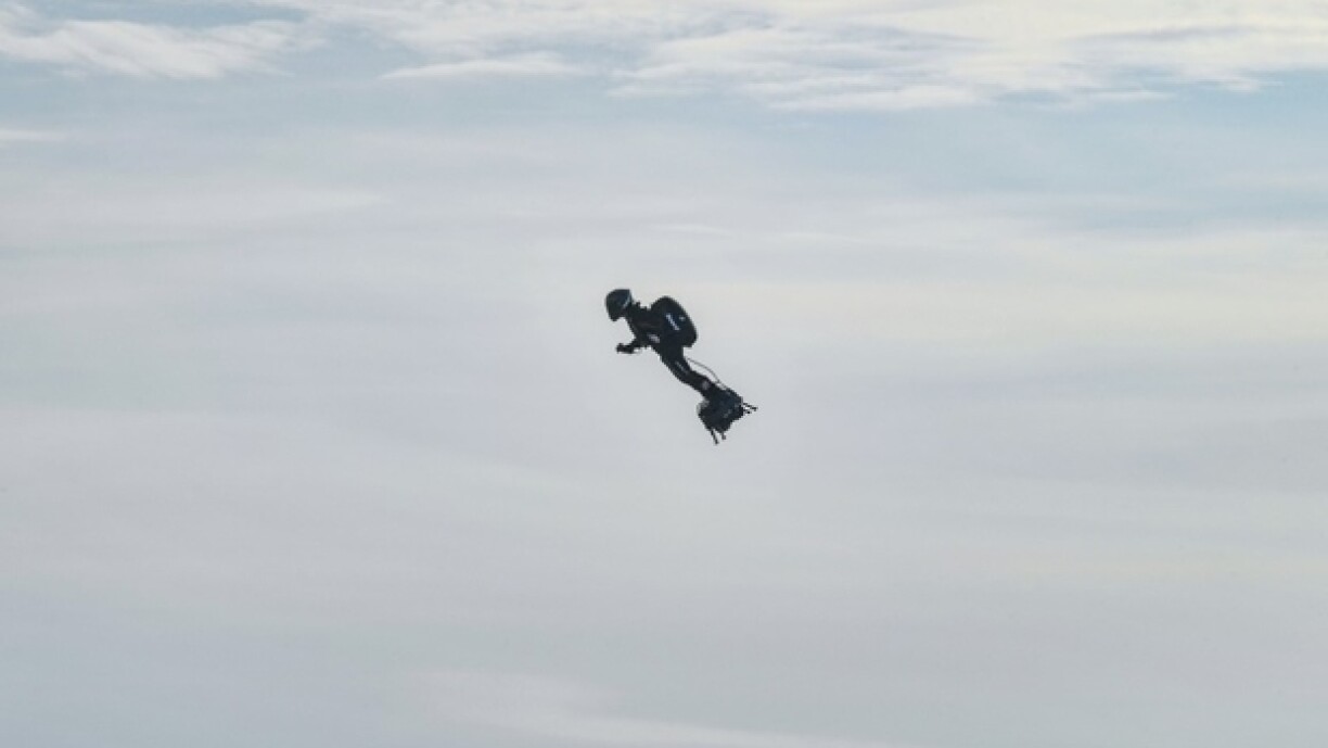 Fir déi ronn 35 Kilometer aus Nordfrankräich, iwwert d’Manche bis op Dover, huet den als “Homme volant” bekannte Fransous ronn 20 Minutte gebraucht. De Sprit, deen hien an engem Rucksak bei sech huet, geet awer just duer fir d’Halschent vun der Streck, dofir muss op hallwem Wee nogetankt ginn.