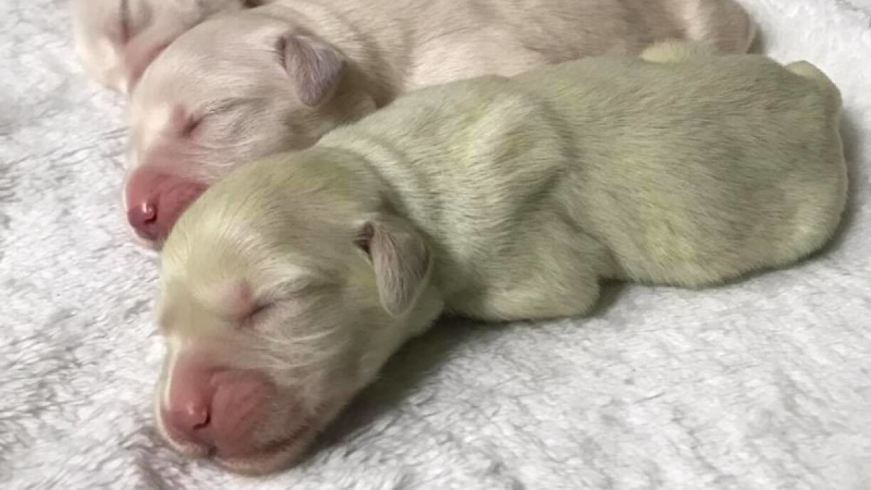 Dem Golden Retriever Mojito säin Numm hält, wat e versprécht. Net wäiss oder beige, mä hell gréng liicht dem Mippche säi Fell, dee viru kuerzem d’Liicht vun der Welt erbléckt huet. Geféierlech ass d’Faarf vu sengem Fell allerdéngs net.
