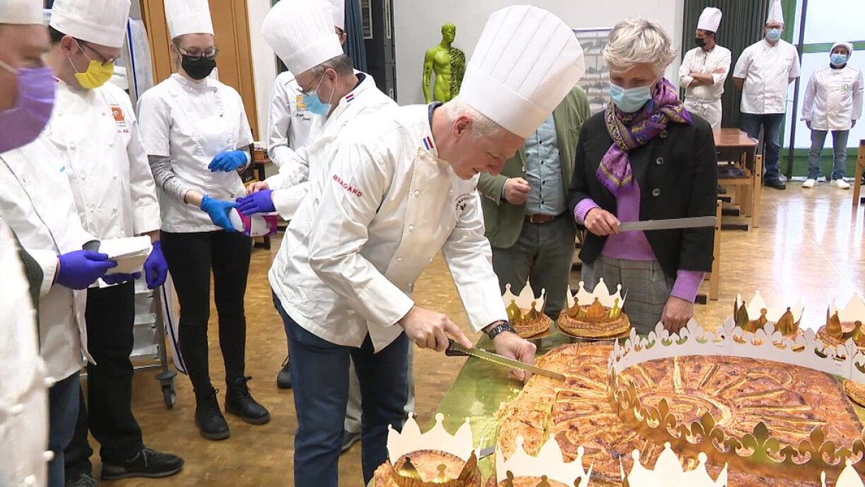 Opgeschnidden an un d’Schüler verdeelt gouf d’Galette des rois a Presenz vun den Éieregäscht vun der Handwierkerkummer an der Fédération des Artisans.